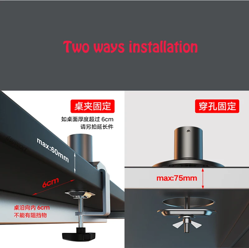 Dos formas de instalación: Grosor de la Mesa de sujeción de escritorio 10-60mm;