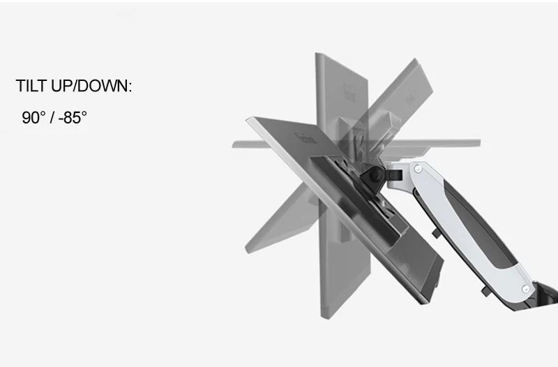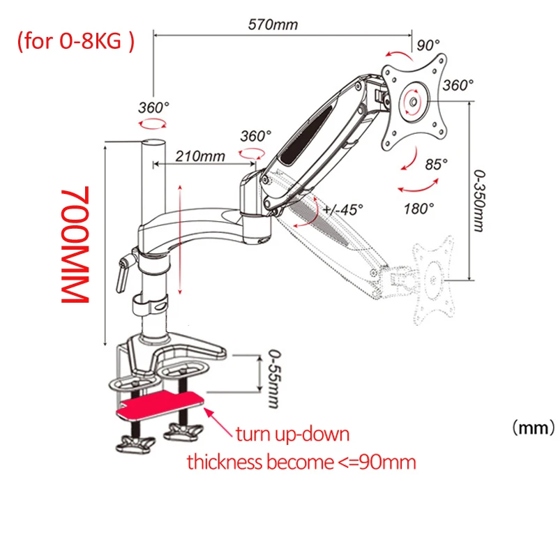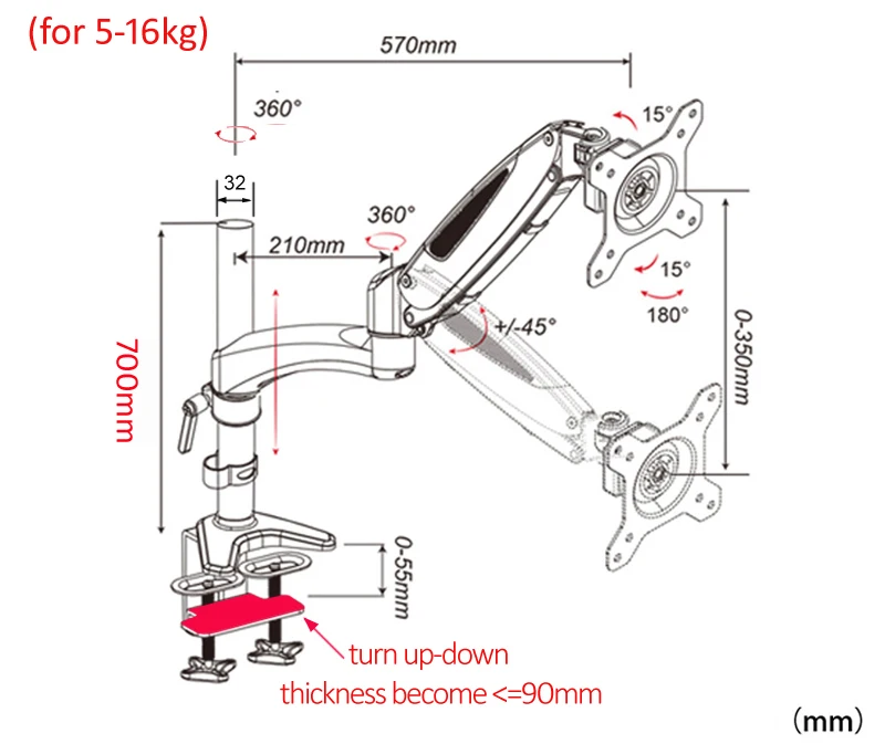Inclinación hacia arriba/hacia abajo:90 °/-85 ° (0-8kg uno) y 15 °/-15 ° (5-16kg uno)