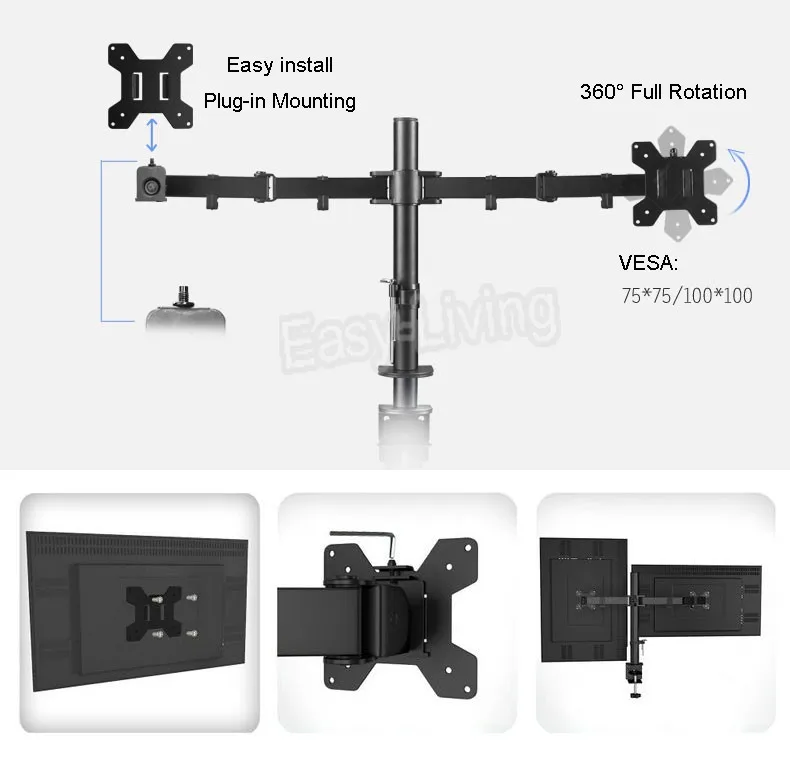 Soporte de escritorio Full Motion Soporte de monitor dual de 360 grados 10 "-27" LCD LED Monitor Montaje Brazo Carga 8kgs Cada cabeza
