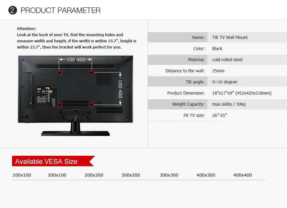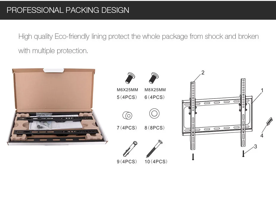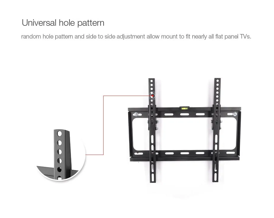 -- El patrón de orificios aleatorios y el ajuste de lado a lado permiten que el soporte se ajuste a casi todos los televisores de pantalla plana, soporte100x100 mm; 200x100 mm; 200x200 mm; 300x200 mm; 300x300 mm; 400x300 mm; 400x400m