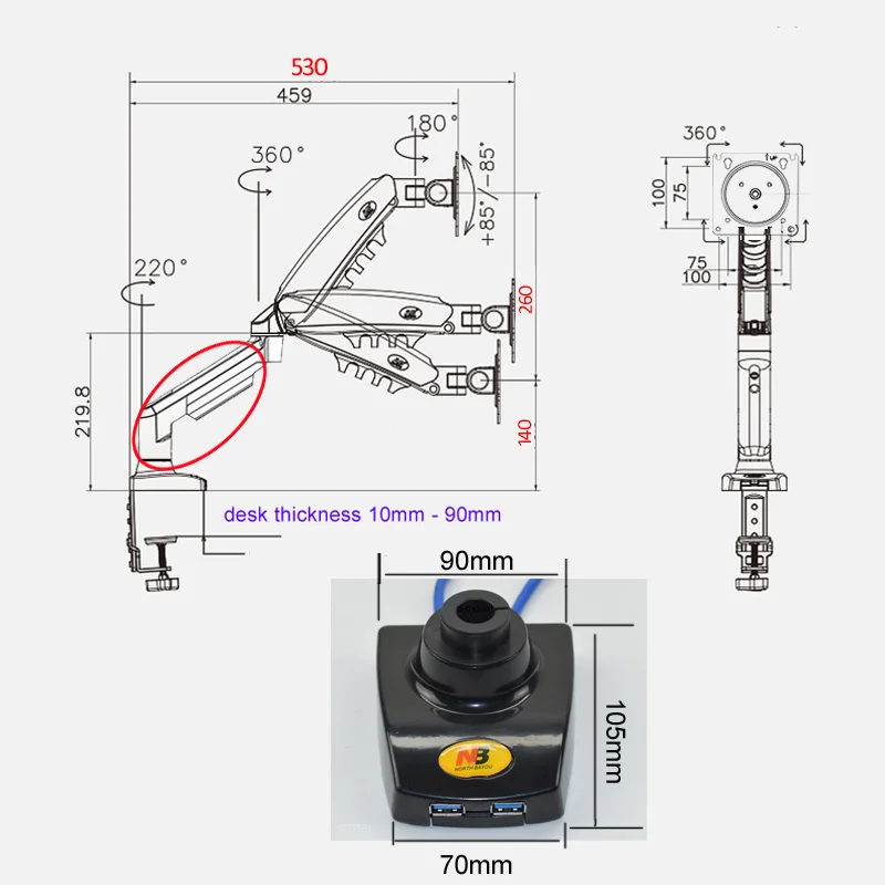 Instalación de la abrazadera: Grosor del escritorio 10-90mm, ancho=40mm