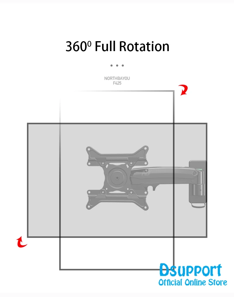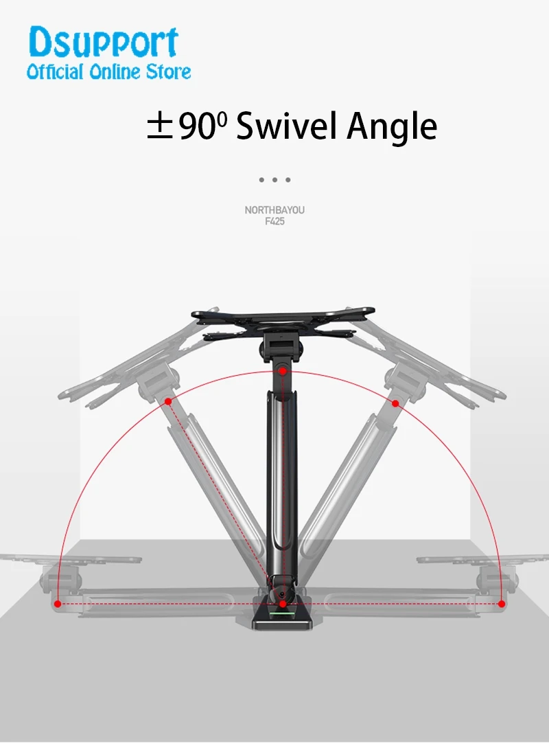 Construido con un cilindro de puntal de Gas duradero, F425 le permite mover la TV o mostrar cualquier dirección y altura que desee. Con el diseño de la Junta pivotante de fricción adicional se ofrece una posición de inclinación sin esfuerzo para eliminar los ángulos de visión grises y una amplia gama de posición giratoria cubierta hasta 180 °.