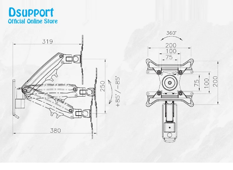 Placa frontal diseñada con 75x75 a 200x200mm compatible con VESA, ángulos de inclinación integrados + - 85 grados y rotación de 360 grados. La carga máxima es de 6,6 a 28,6 libras (3-13 kg).