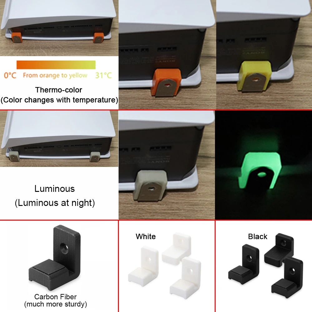 Tipo: Soporte de pared Estilo: Blanco, Negro, fibra de carbono, luminoso, Themo-color Modelos aplicables: Para Sony PlayStation5 PS5 Consola Junta de silicona: antideslizante y diseño a prueba de golpes Junta de metal: desempeña un papel de soporte y refuerzo, el soporte único puede soportar el peso de 26 libras. Se adapta perfectamente a su máquina. Fácil y cómodo de usar. Características: 1. El soporte duradero mantiene su consola de la serie PlayStation 5 firmemente en su lugar 2. Impresión 3D de alta precisión de grado industrial, el soporte de pared ofrece un agarre óptimo en la pared 3. El diseño antideslizante y a prueba de golpes protege su consola PS5 de golpes accidentales. El paquete incluye: 1 Juego de soportes para consola (3 unids/set) 4 x tornillos de expansión 4 x tornillos autorroscantes 2 x junta de metal Notas: 1. Viene solo con el soporte, Y la consola de juegos no está incluida 2. Nuestro soporte de pared admite colgar positivo/colgar inverso para la edición digital de PS5, admite colgar positivo para la edición de PS5, no es compatible con colgar inverso para la edición de PS5 en la edición de PS3, 2.