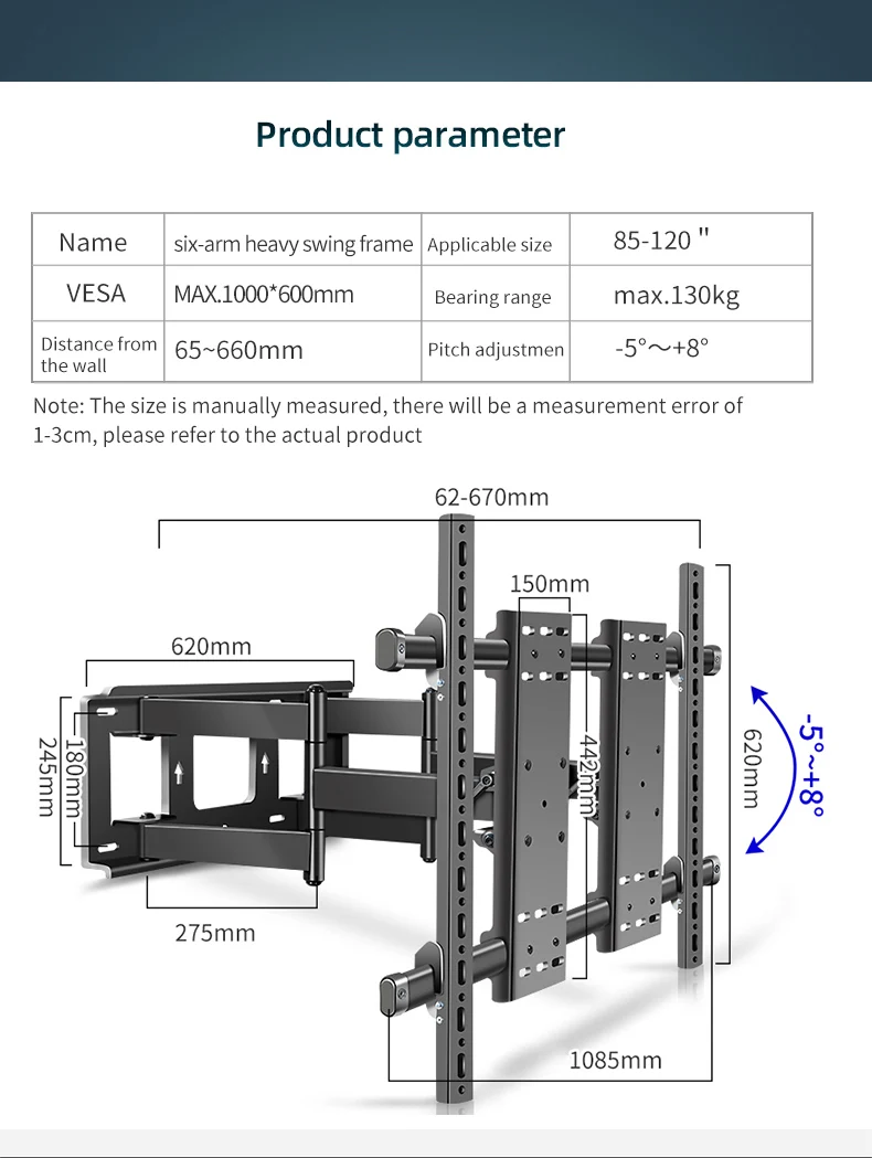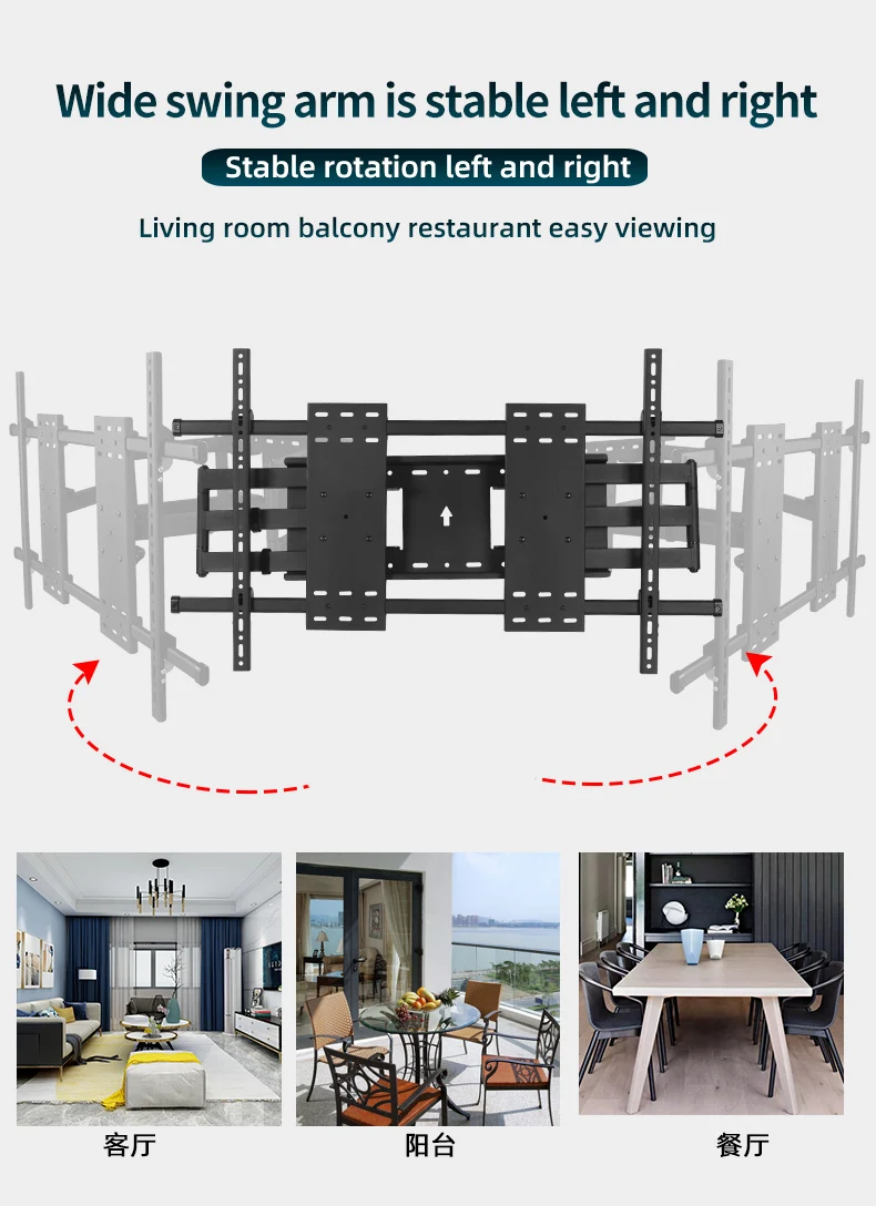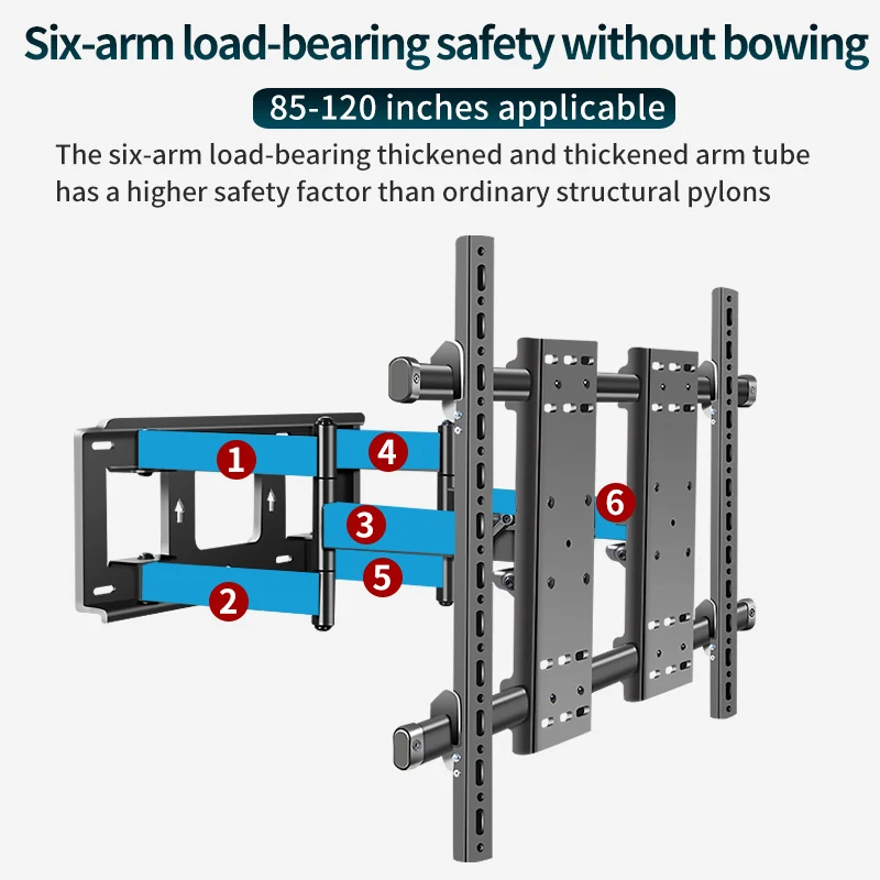 85-120 ''TV Soporte de pared Ángulo ajustable 6 brazos Soporte más fuerte Soporte para TV Hasta 130 kg Lps VESA 1000*600 DY1000Soporte para TV de montaje en pared de movimiento completo