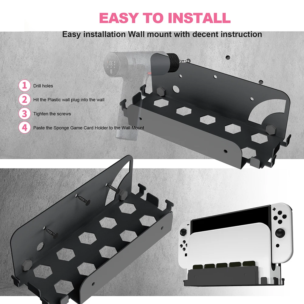 3. Montaje de pared que ahorra espacio:Utiliza el espacio de tu pared de manera efectiva con este soporte para mandos de juegos. Colóquelo de forma segura con los tornillos incluidos, lo que garantiza la estabilidad y la seguridad de la consola Nintendo. Al mantener su interruptor/interruptor OLED fijo en la pared, puede evitar daños accidentales y crear un área de juego sin desorden.
