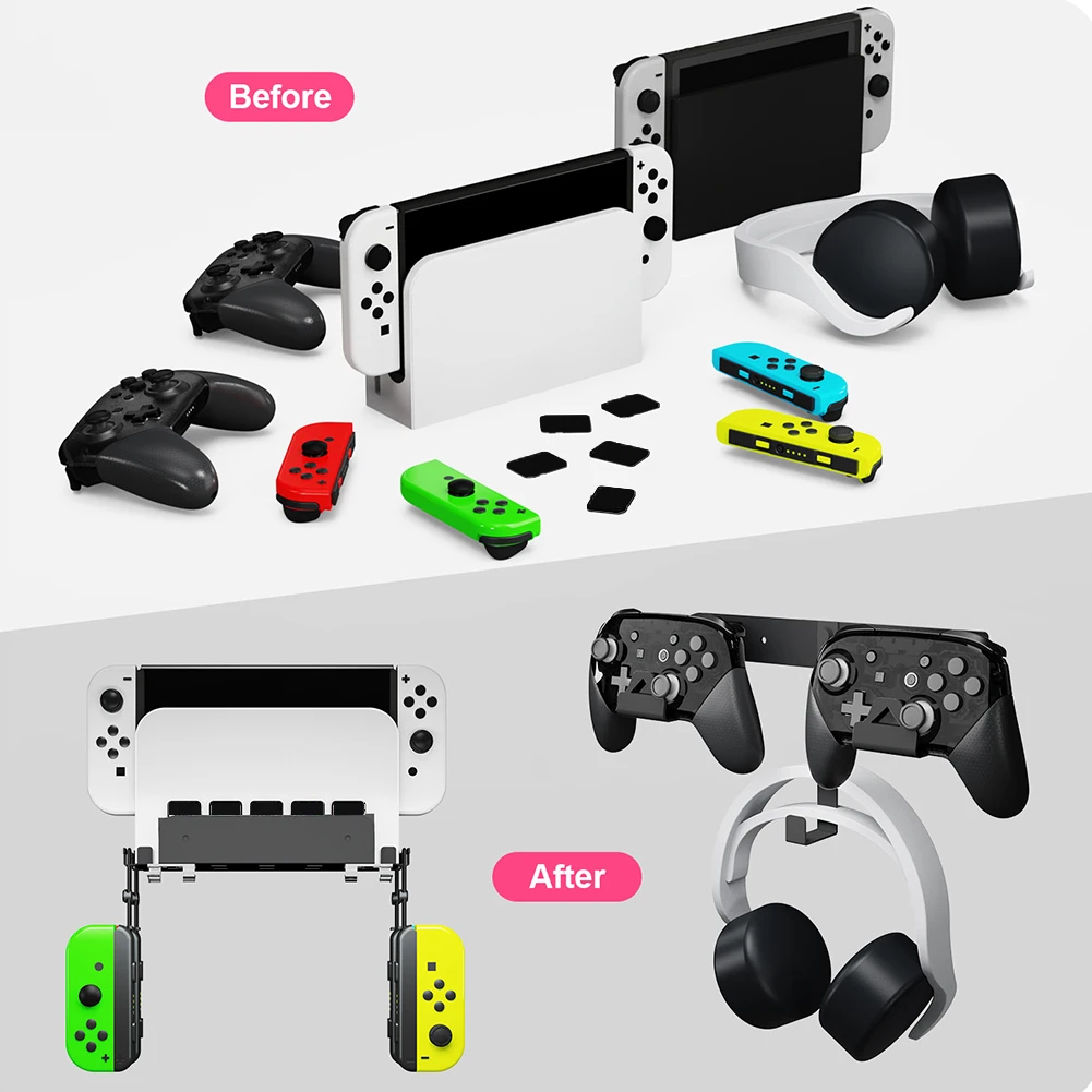 1. Organizador universal:Este soporte de pared está diseñado para acomodar tanto las consolas Switch como las Switch OLED, así como controladores Joy-Con, tarjetas de juego, auriculares y controladores Pro. Mantenga todos sus elementos esenciales de juego en un solo lugar, maximizando el espacio de la pared mientras mantiene su configuración de juego organizada.