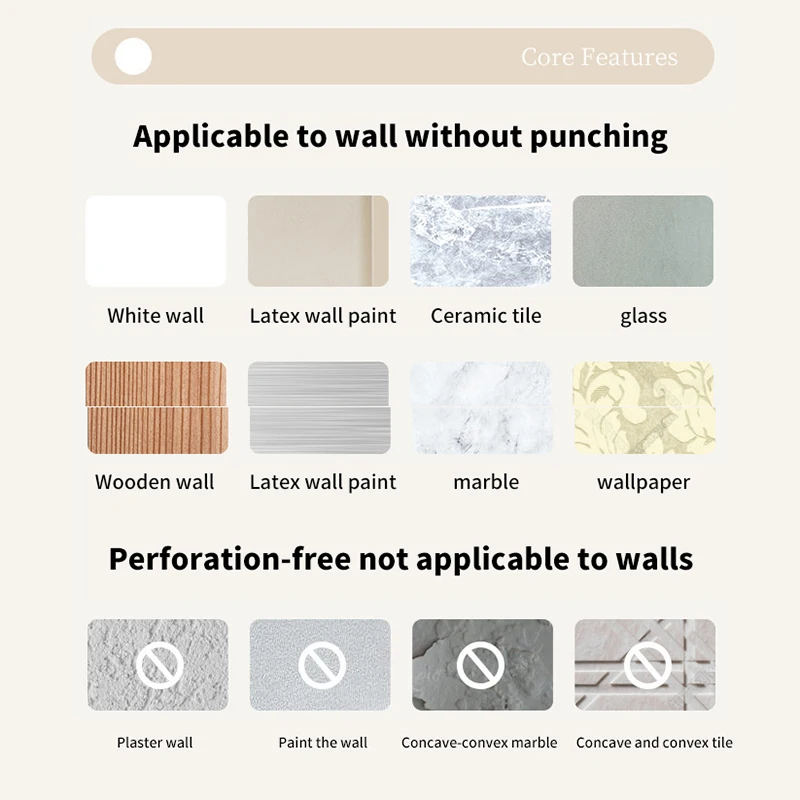 2.Diseño sin perforaciones: diseño de ventosa o diseño de pegamento trasero, sin perforaciones, no puede dañar la pared, es conveniente mover e instalar en cualquier superficie o pared lisa.