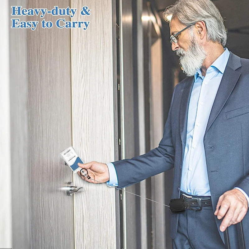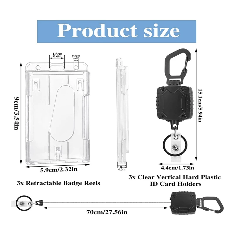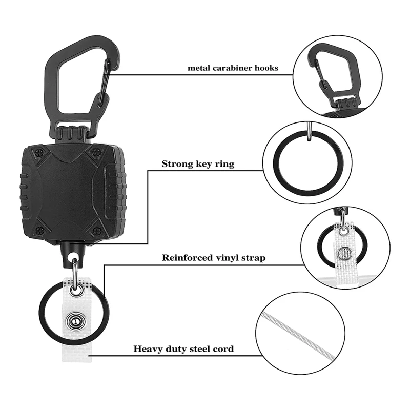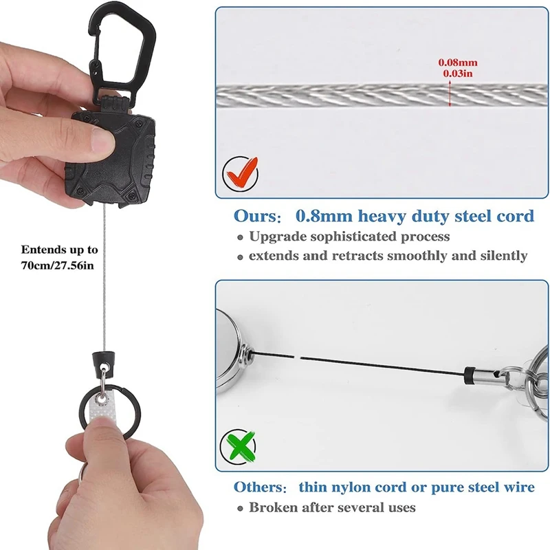 Utilizando una mano de obra compleja mejorada, utilizando un cable de acero resistente de 0,8 mm, tiene una fuerte fuerza de retracción, no es fácil de romper y se extiende suavemente hasta 23,5 pulgadas para un uso fácil.Nuestro porta credencial retráctil tiene una capacidad nominal de más de 10,000 tirones y soporta hasta 8 oz.