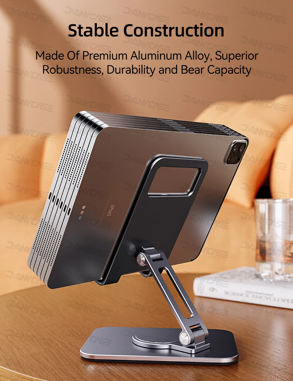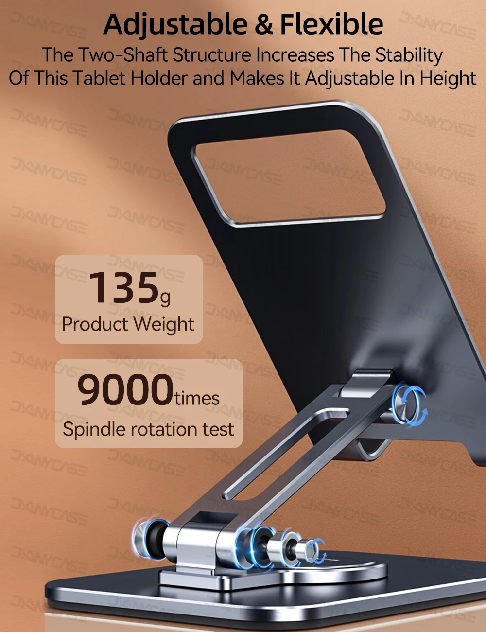 La estructura de dos ejes aumenta la estabilidad de este soporte de tableta y lo hace ajustable en altura.