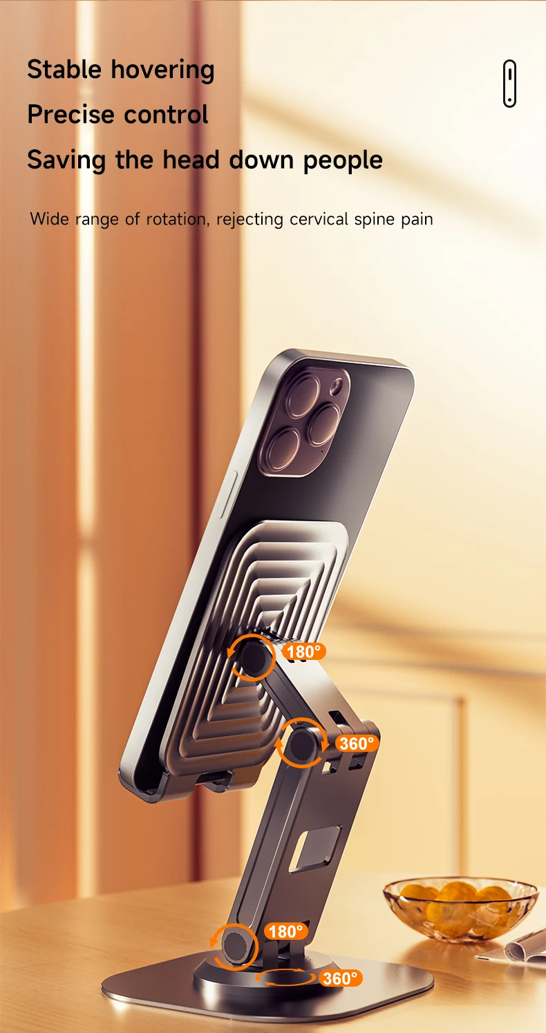 El soporte es robusto y se mantiene firme sobre la mesa; tiene una rotación de 360 grados, y el teléfono encaja perfectamente.