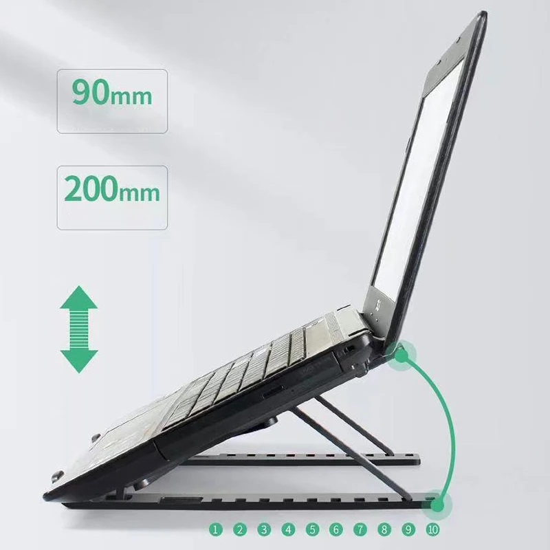 Introducción del producto Nombre del producto: soporte para portátil Método de embalaje: caja de embalaje Ajuste del número de marchas: 10 Ordenador aplicable: todos los ordenadores portátiles del mercado general Material del producto: plástico ABS Función del producto: Soporte de computadora, que es beneficioso para el enfriamiento rápido de computadoras portátiles después del soporteNota:
