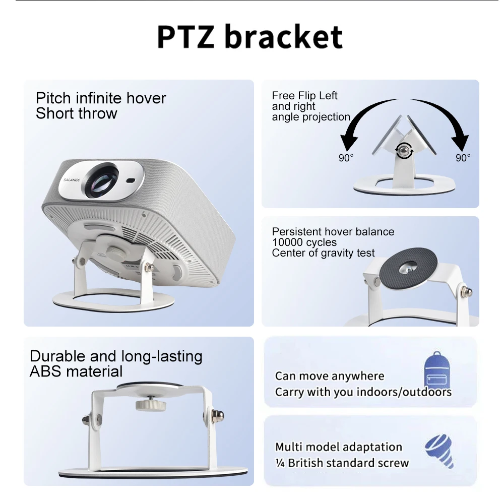 El soporte adopta un diseño de junta universal de un solo eje, que se puede ajustar en múltiples ángulos. Cambie fácilmente la posición del proyector para obtener un mejor ángulo de visión.