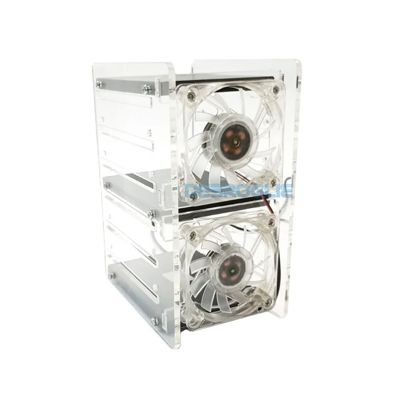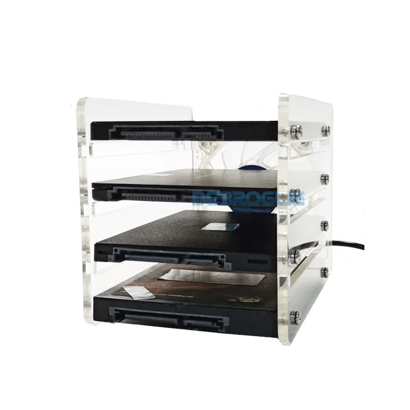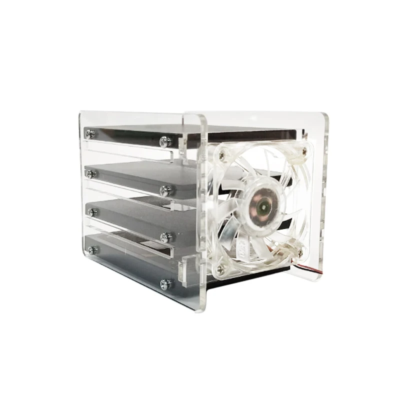 4F con ventilador USB: incluye 4 bahías de disco duro + tornillos + 1 ventilador transparente USB de 6cm.
