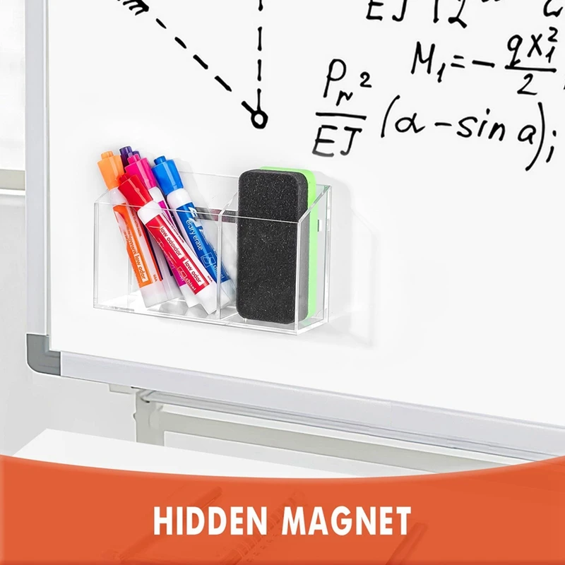 [COMPARTIMENTOS MÚLTIPLES]-El soporte del marcador de borrado en seco viene con dos compartimentos separados que se pueden colocar lejos del borrador de borrado en seco. También es adecuado para organizar bolígrafos, reglas, controles remotos, gafas de sol y más.