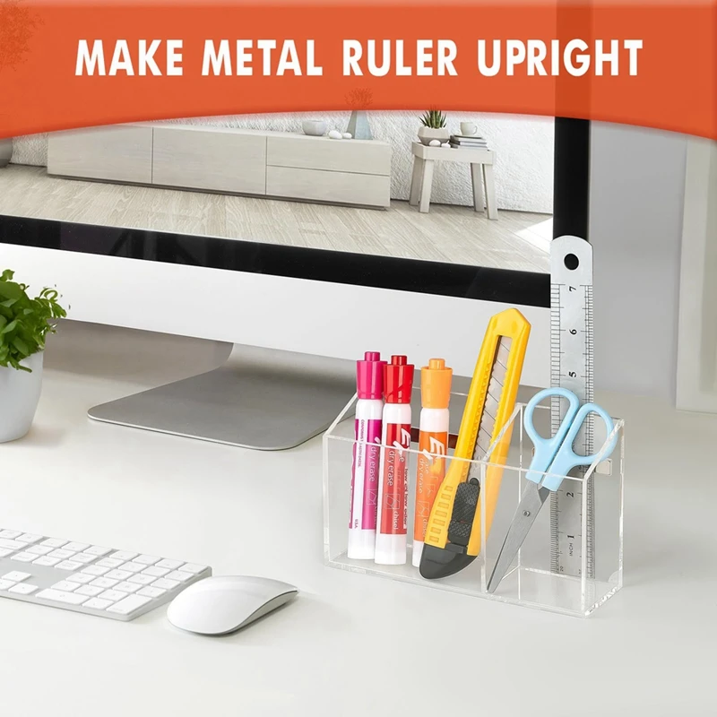 [ALMACENAMIENTO DE REGLA DE METAL]-El estuche de lápices se puede usar en un escritorio y sirve como organizador de escritorio. Su capacidad para almacenar y mantener reglas de metal en posición vertical, lo que hace que el uso de reglas sea muy conveniente.