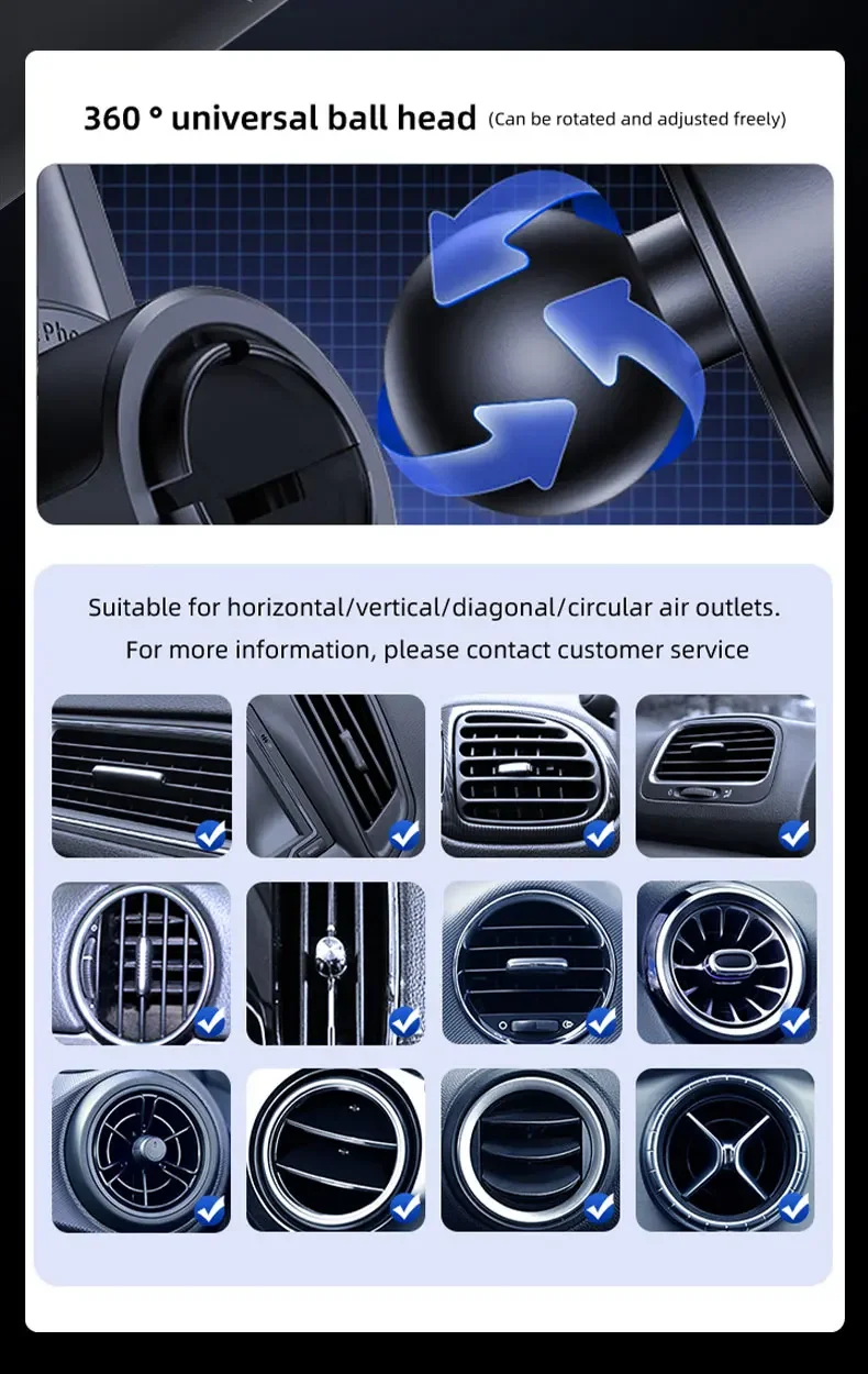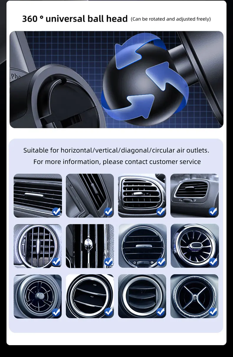 6. Estabilidad y seguridad: acolchado con silicona suave antideslizante y que absorbe los golpes. Los clips de este soporte para teléfono protegen las rejillas de ventilación del automóvil o los teléfonos contra rasguños.Incluso en caminos con baches, el teléfono permanecerá donde está y se cargará de manera estable.Puedes operarlo con una sola mano, 360° La bola giratoria puede adaptarse a todas sus posturas de conducción para mayor seguridad.