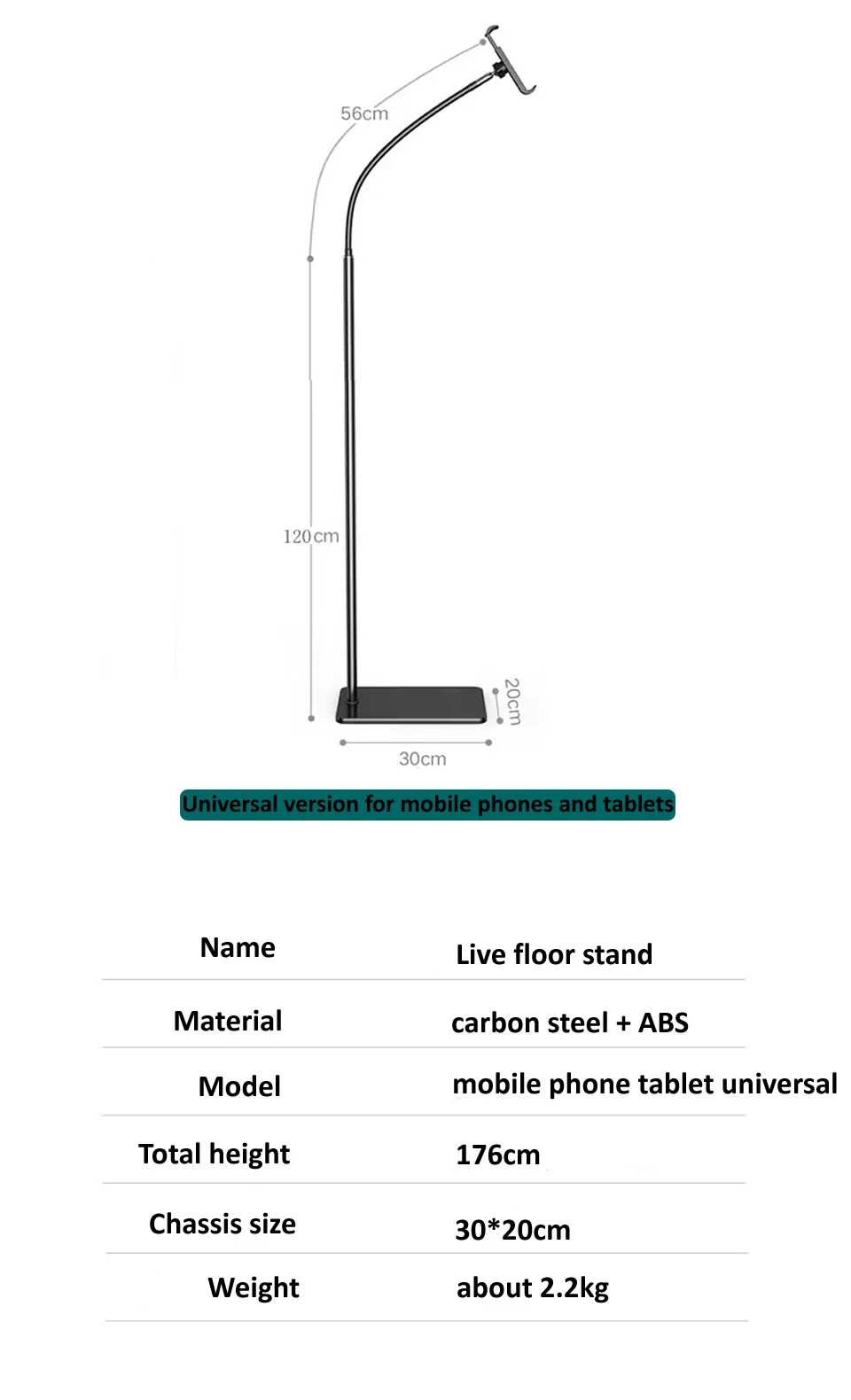Soporte de suelo para trípode de 1,76m, soporte plegable para teléfono móvil de 4-12,9 pulgadas