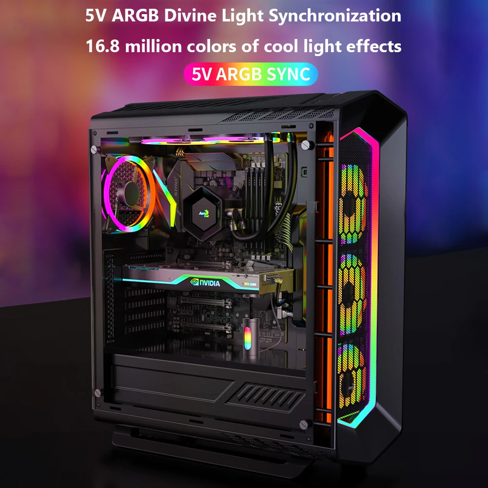 3.Sincronización de iluminación ARGB:El soporte para GPU de la tarjeta gráfica viene equipado con un diseño de interfaz dual ARGB de 5 V y 3 pines, lo que mejora la capacidad de expansión del producto.Admite interfaces de sincronización ARGB de las principales marcas de placas base como compatible con ASUS, compatible con MSI, compatible con Gigabyte y compatible con ASRock, lo que permite efectos de iluminación controlados por software con 16,8 millones de colores programables.La iluminación vibrante y suave añade un toque deslumbrante a tu configuración.