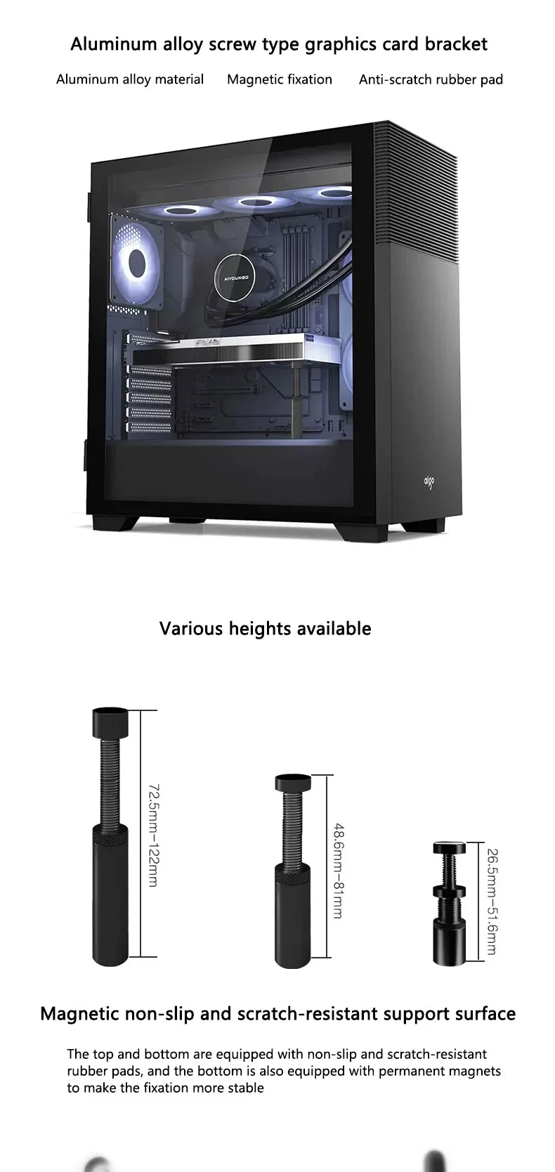 El soporte de la tarjeta gráfica soporta puntos en la superficie del gel con almohadillas adhesivas para evitar rayar las tarjetas. La parte inferior directa del soporte de la tarjeta gráfica está diseñada con imán + silicona, que se puede adsorber en materiales de hierro como el compartimiento de energía, la placa inferior del chasis y una adsorción estable para brindar soporte.
