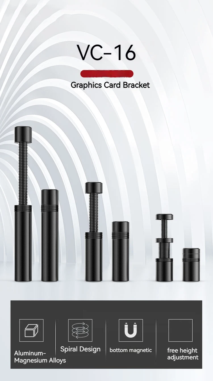 Diseño helicoidal telescópico.El soporte de la tarjeta gráfica adopta un diseño de tornillo telescópico.La altura se puede ajustar libremente, adaptándose a diversas especificaciones del chasis.Proporciona un soporte eficaz para la parte posterior de la tarjeta gráfica y acompaña la tarjeta gráfica.