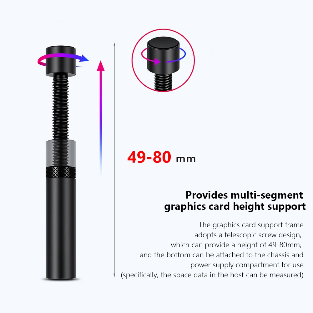 1. Diseño de tornillo telescópico:El soporte de la tarjeta gráfica adopta un diseño de tornillo telescópico, y el GX-30 puede proporcionar un rango de Soporte de altura de 49-80mm. La altura se puede ajustar libremente, se adapta a varias especificaciones del chasis y proporciona un soporte efectivo para la parte posterior de la tarjeta gráfica.