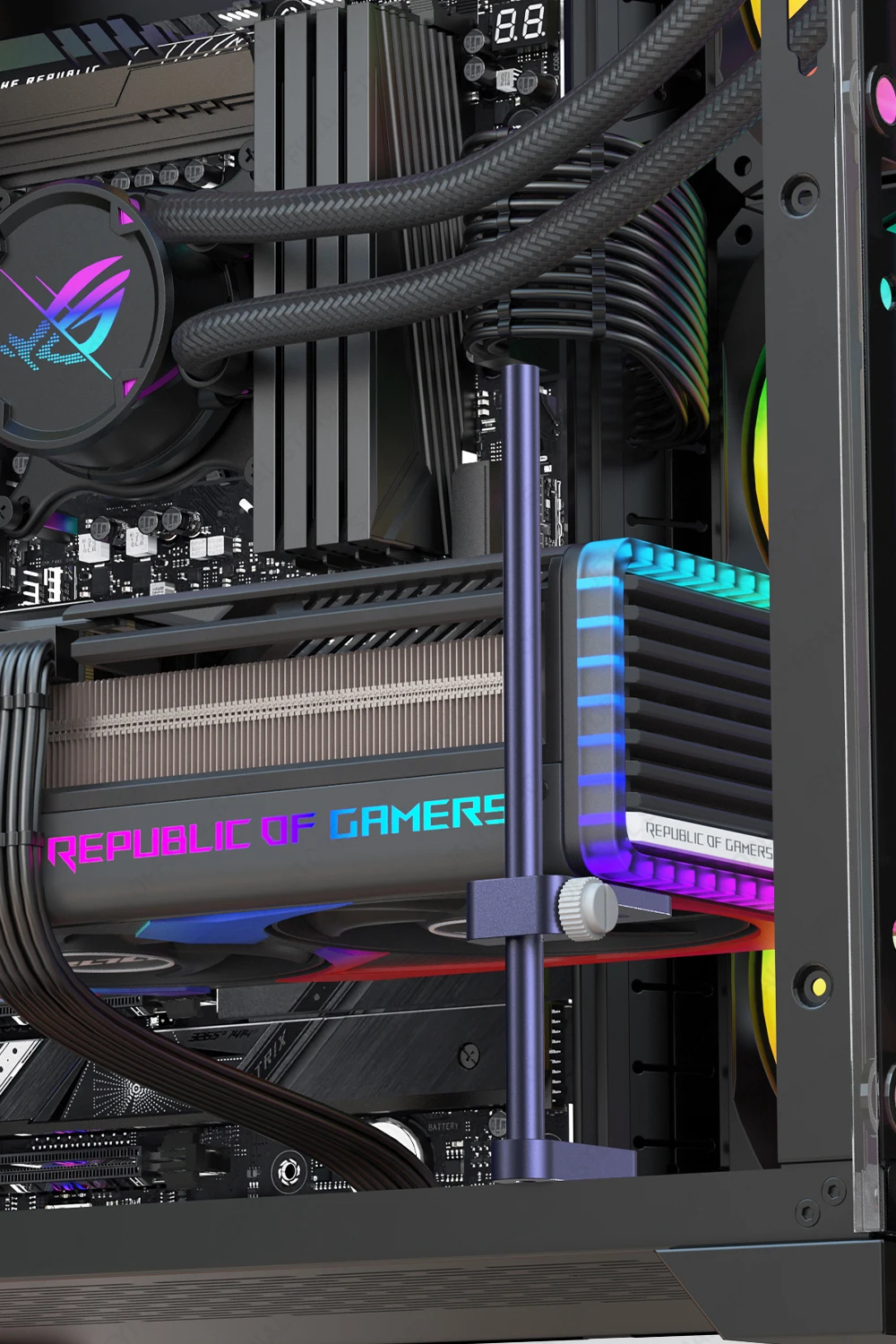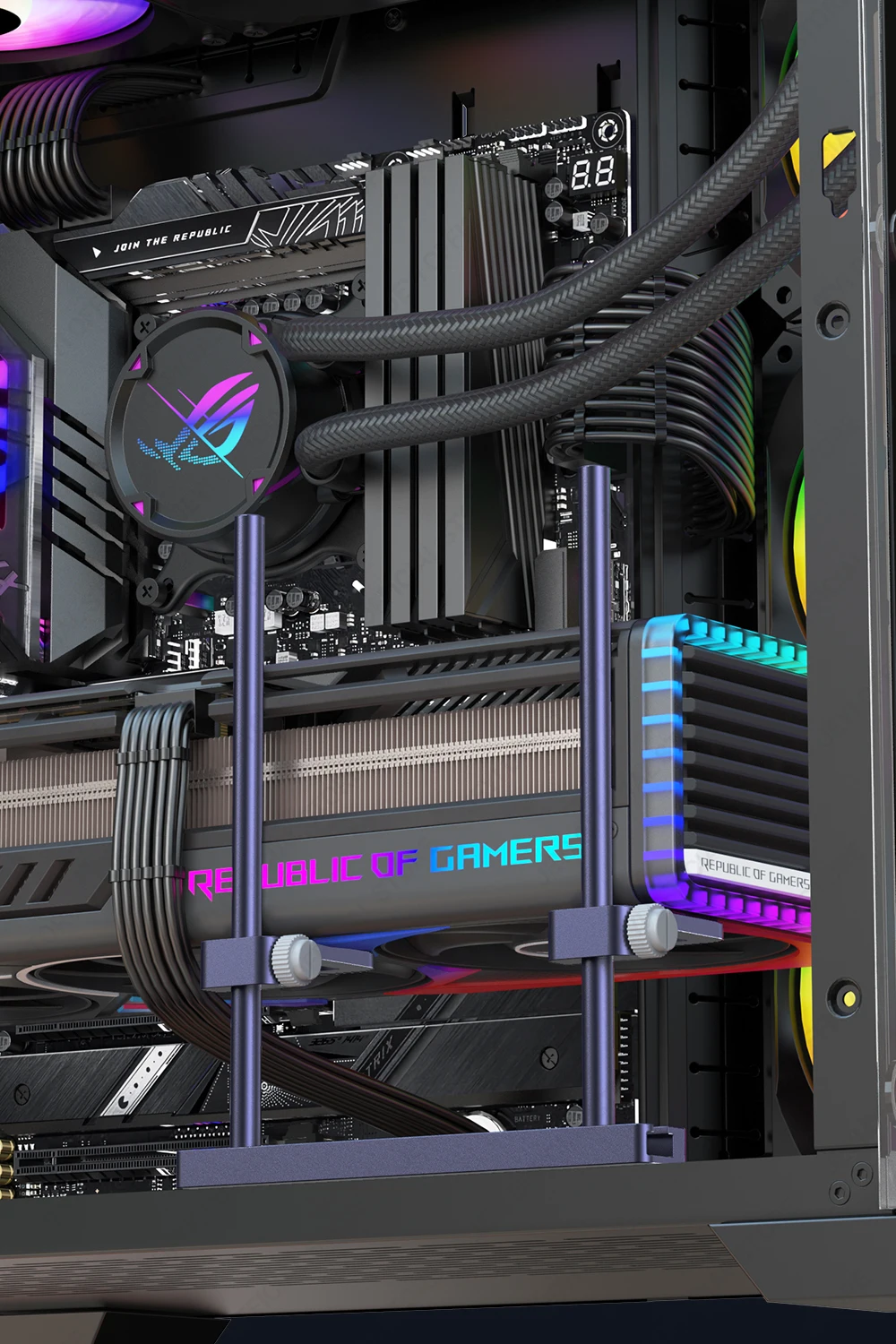 Extensión ajustable: Con dos varillas verticales de aluminio, nuestro soporte permite un fácil ajuste del alcance para adaptarse a diversas necesidades de soporte, lo que garantiza la compatibilidad con una amplia gama de carcasas de PC.