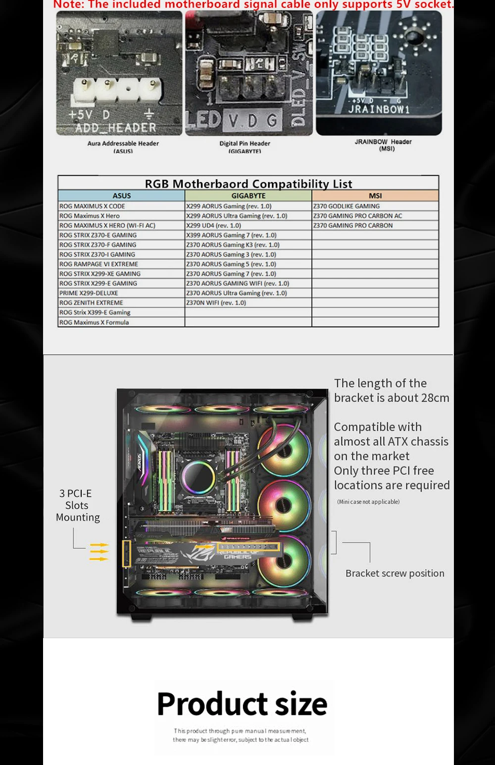 Características1. Material de aluminio y acrílico importado2. Luces LED de alta calidad3. Colorido RGB verdadero sinfonía de 16 colores4. Grabado de precisión de alta gama, nunca se quita la pinturaEstilo1. Efectos RGB-16 coloresGradiente, saltar, apagar las luces, siempre encendido, fijo, flash, brillo, control de velocidad y otras funciones (admite control remoto o sincronización de placa base)2. Efectos ARGB-16 coloresOriginario para traer 133 tipos de efectos de fantasía. Los efectos especiales y los cuchillos múltiples no se pueden escribir aquí. (múltiples excusas para satisfacerte)Nota: Se requieren 3 ranuras PCI (chasis grande ATX, no se puede instalar chasis pequeño)La Longitud del cable es de aproximadamente 30cm. Es adecuado para la posición de la interfaz de la esquina inferior izquierda de la placa base. En otros lugares, necesita tomar otro cable de extensión RGB.Compatible con el sistema de iluminación ASUS AURA. La siguiente barra de luz está conectada directamente a la interfaz de la placa base: