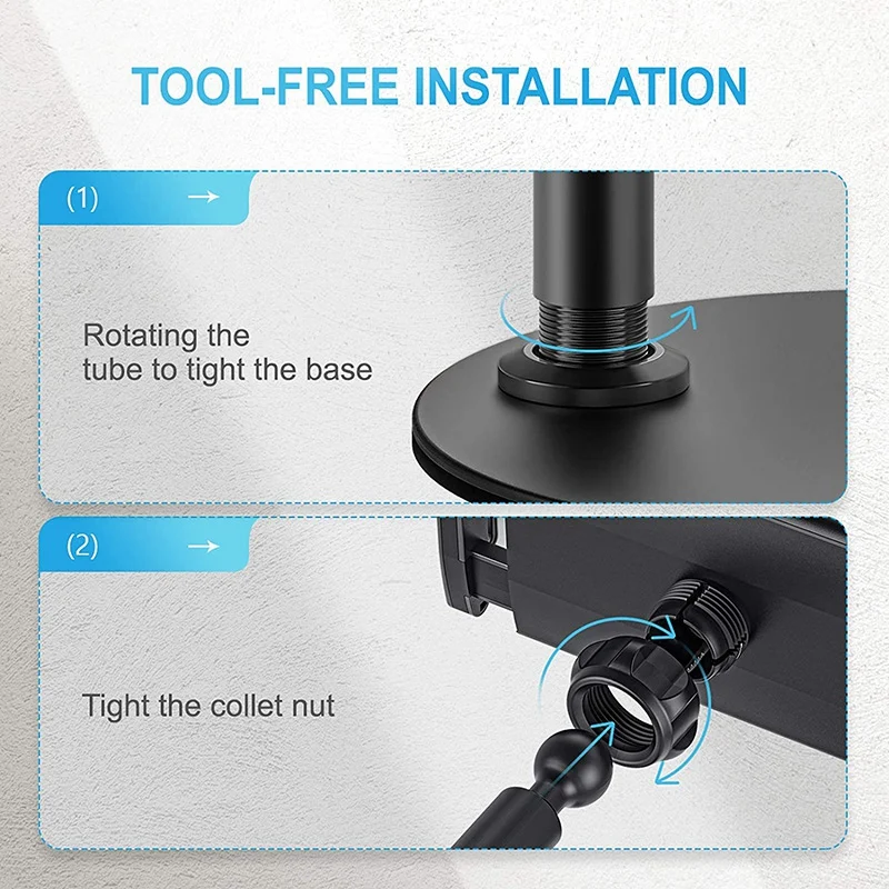 [360° Rotation & Height Adjustable]- for iPad stand comes with a flexible gooseneck arm with a 360°swivel ball head. The horizontal angle is 360°, and the vertical angle is 180°. The height can be easily adjusted from 210mm to 340mm, providing you a comfortable viewing angles.