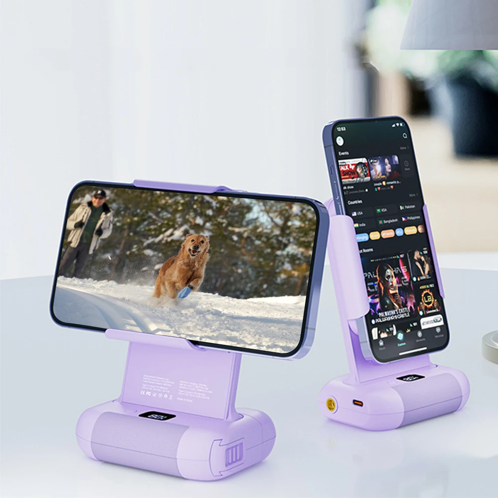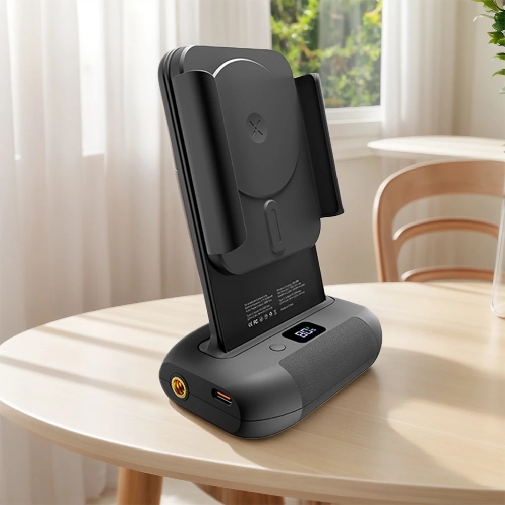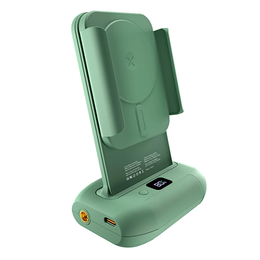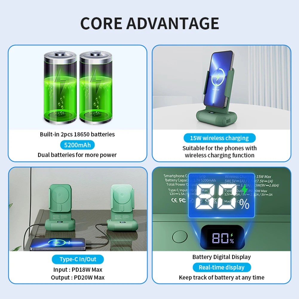 4. Banco de energía de carga dual:El cargador inalámbrico actúa como un potente banco de energía con capacidad de 5200 mAh, compatible con carga por cable e inalámbrica para mantener sus dispositivos encendidos mientras viaja.
