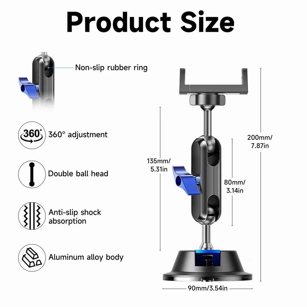 Soporte para teléfono móvil para coche, potente ventosa, absorción de impactos 360° Cabezal de bola doble con ajuste de múltiples ángulos para parabrisas
