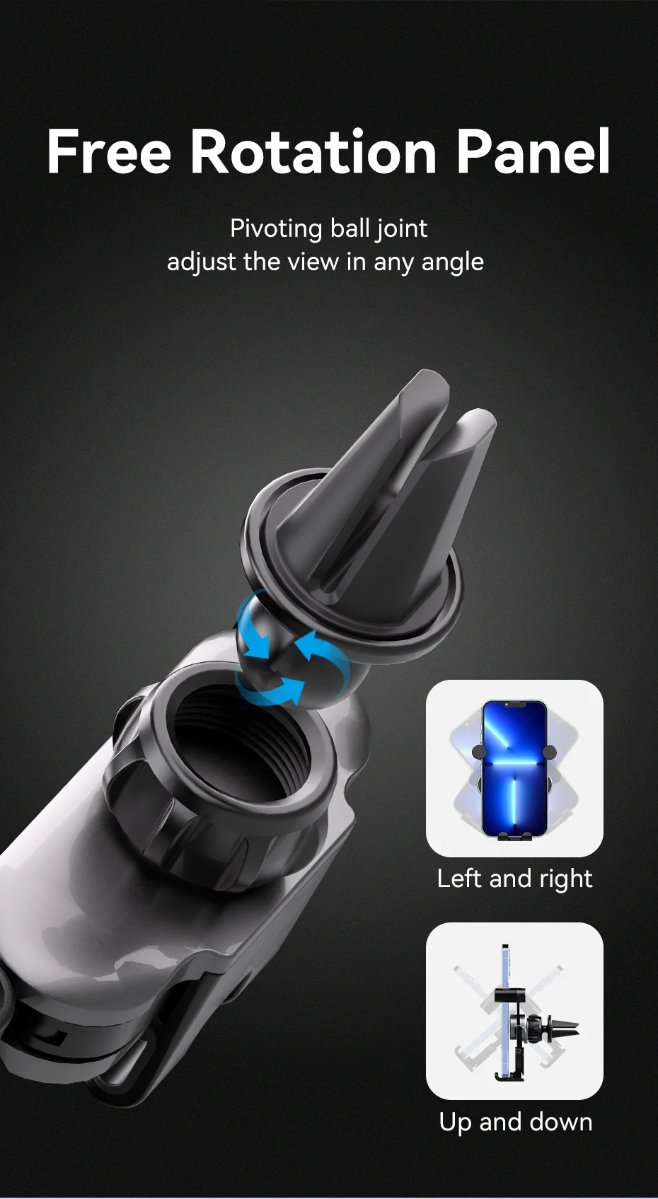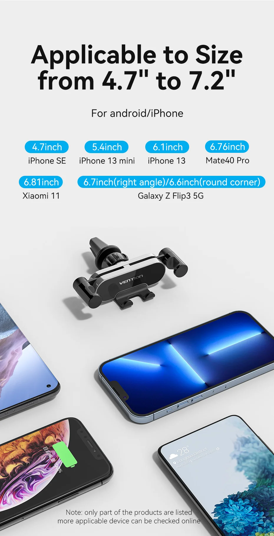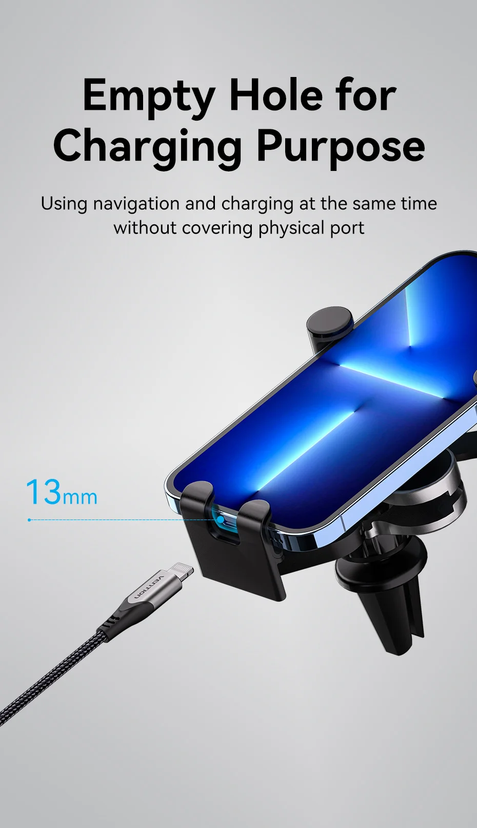 Características: Soporte invisible de conexión por gravedad, fijo multipunto, sin sacudidas; Forma de una palabra, tamaño compacto, no bloquea el orificio del aire acondicionado; Reserve el orificio del cable de carga, no bloquee el enchufe; Silicona de abrazadera trasera, no daña el deflector de salida de aire;