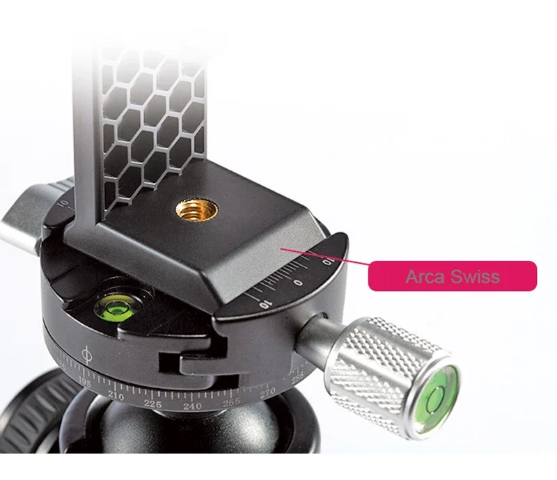 El estándar Arca Swiss es adecuado para la mayoría de las cabezas de bola, y los zapatos fríos duales se pueden instalar con varias lámparas y accesorios de micrófono.
