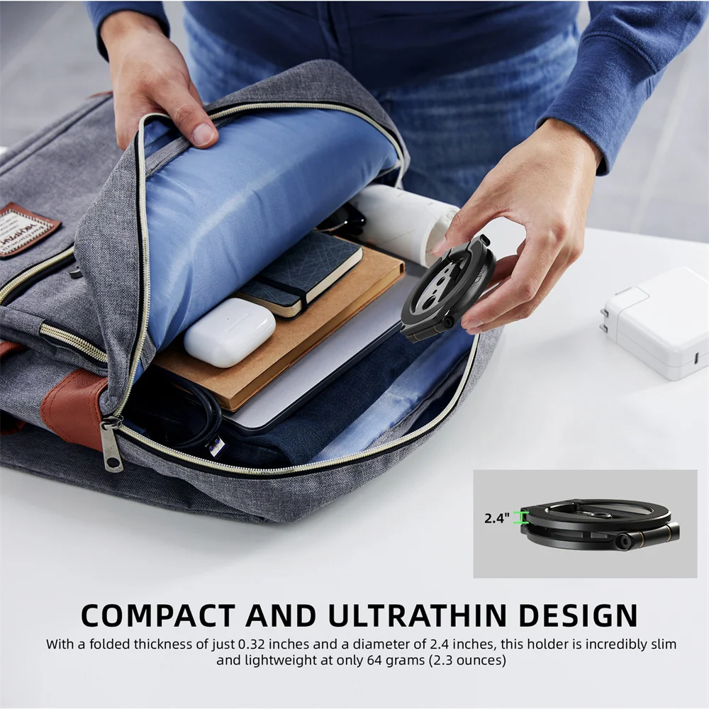 Con un grosor plegado de solo 0,32 pulgadas y un diámetro de 2,4 pulgadas, este soporte para teléfono es increíblemente delgado y liviano, y pesa solo 64 gramos (2,3 onzas)