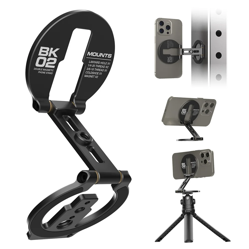 Soporte magnético doble para teléfono iPhone 16 15 14 13 12 Pro Max Plus Series 1/4 ''-20 soporte para trípode 360° Soporte para teléfono de gimnasio plegable ajustable