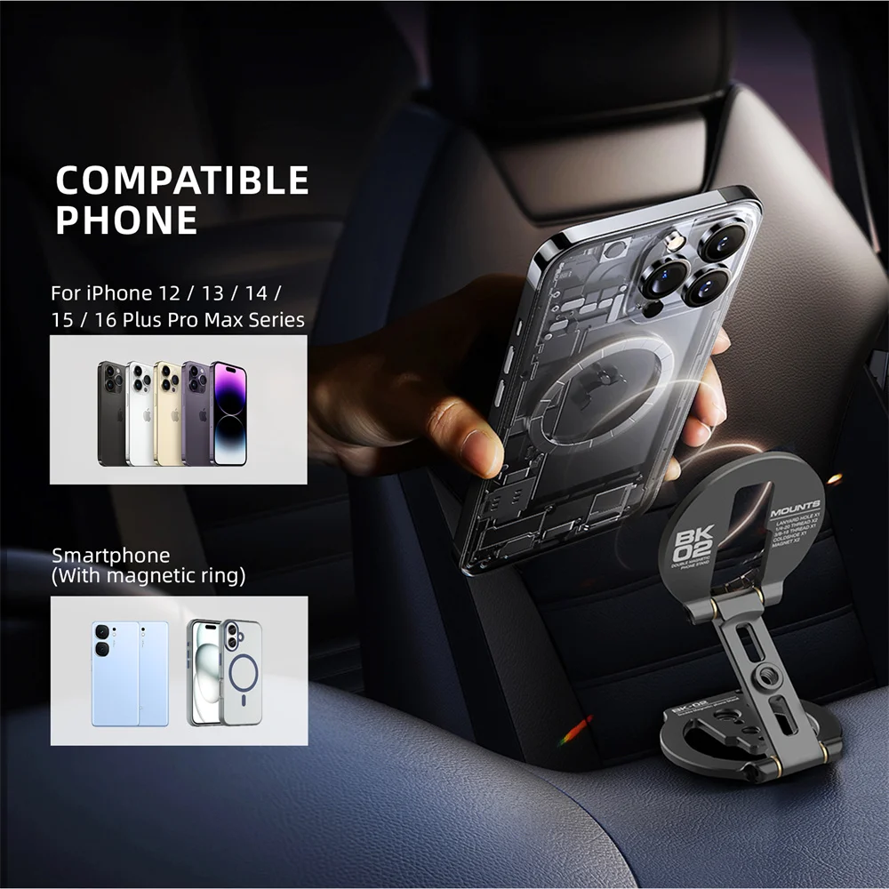 Llama la atención con este soporte magnético dual para teléfono diseñado para las series iPhone 12 a 16 Pro Max Plus.Con orificios para tornillos de 1/4''-20 y 360° Con capacidad de ajuste, este soporte plegable para teléfono de gimnasio le permite conquistar todos los ángulos con una precisión intrépida.Ya sea que esté triturando entrenamientos o capturando contenido audaz, su fuerte agarre magnético y su diseño versátil le permiten superar límites y poseer cada momento.