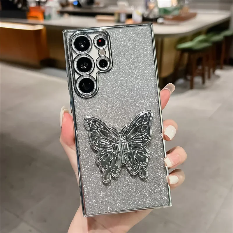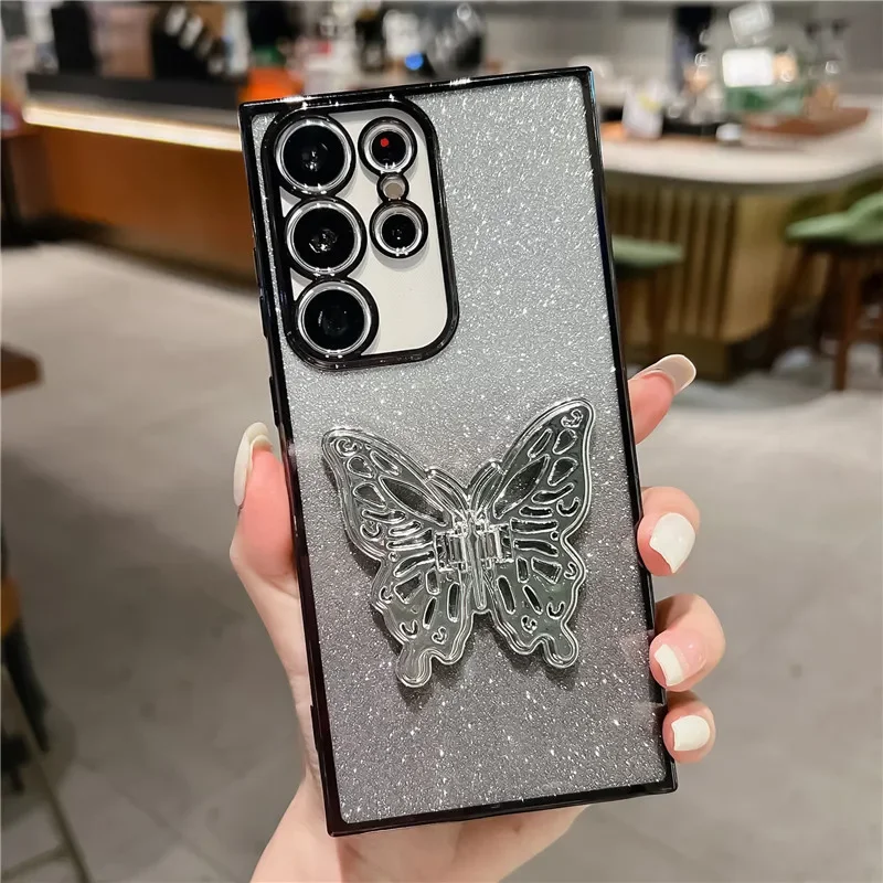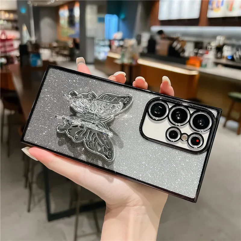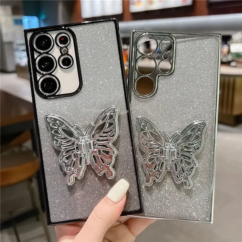 Soporte de teléfono de mariposa de lujo, funda chapada con purpurina para Samsung S24 Plus S23 FE S22 Note 20 Ultra S21 S20 S10 S9 Plus, cubierta trasera