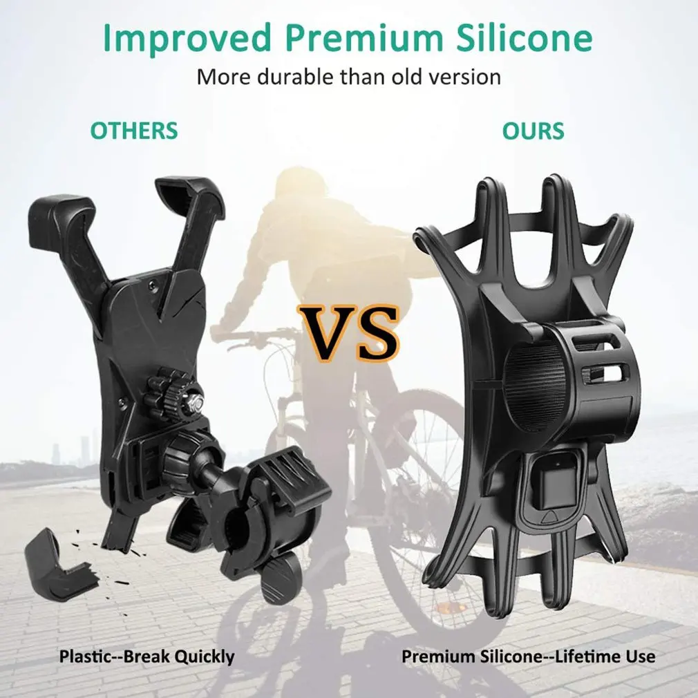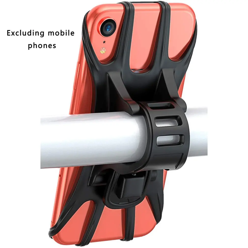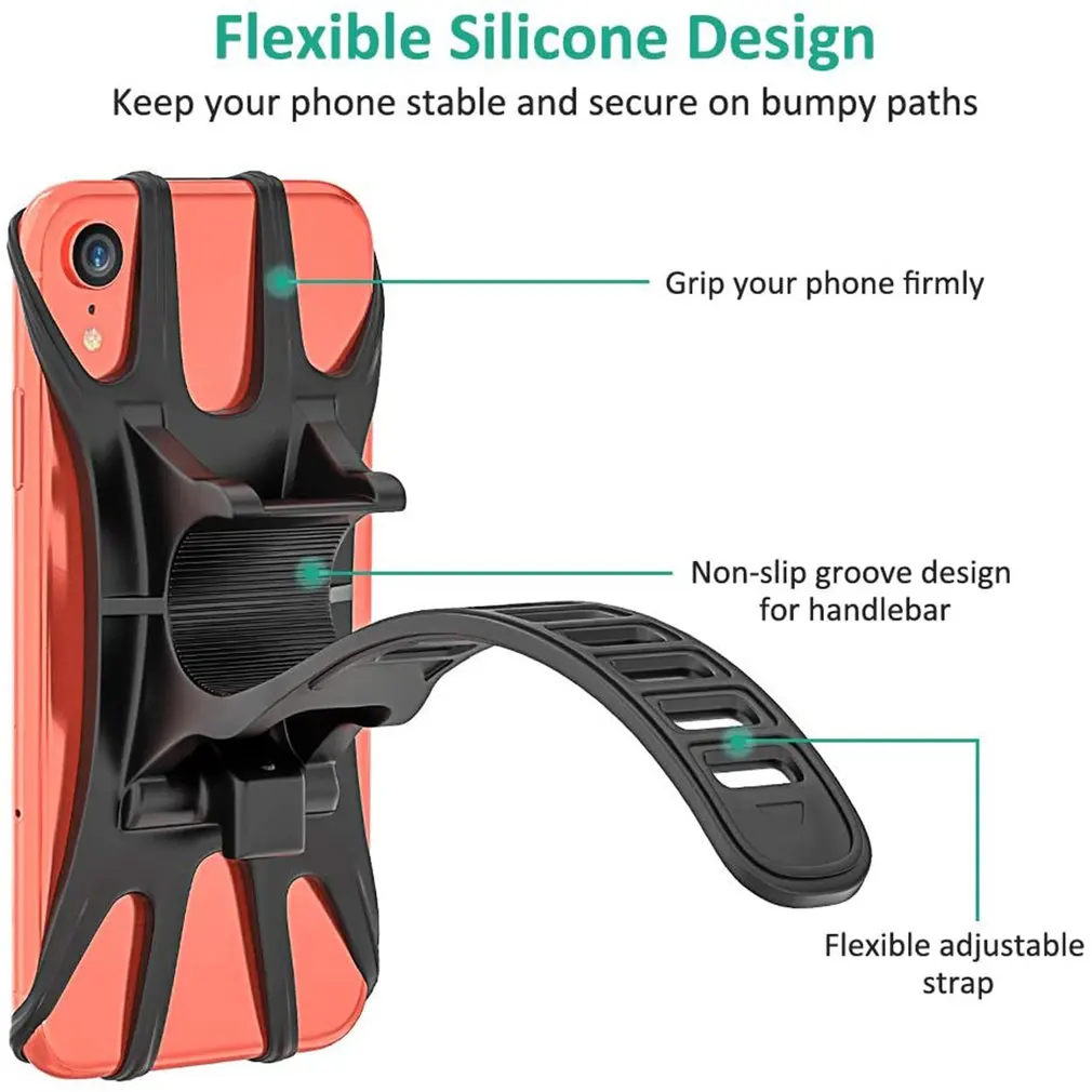 Hecho de material de silicona de primera calidad, el clip flexible del soporte del teléfono absorbe y evita arañazos en el teléfono. Las bandas elásticas de silicona sujetan firmemente su teléfono a la bicicleta, incluso en una carretera con baches.