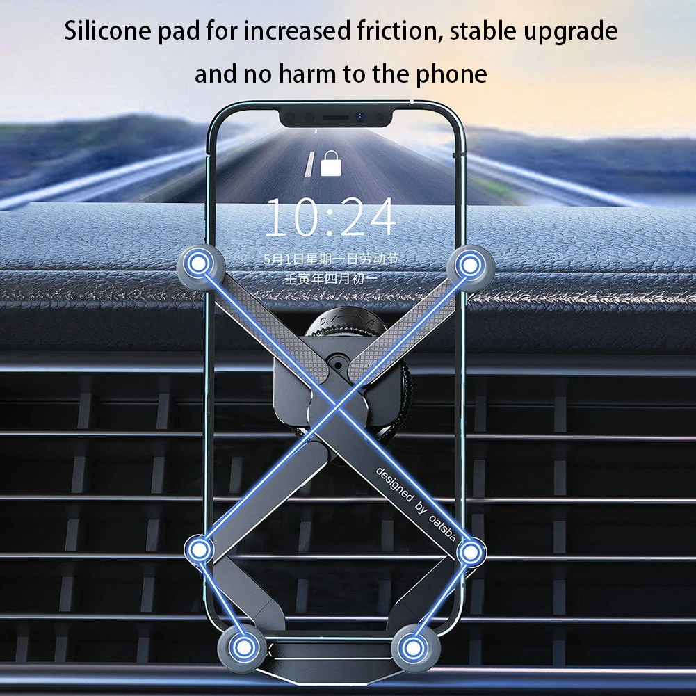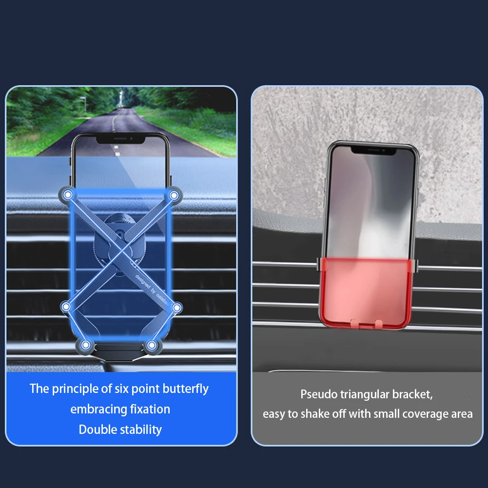 2. Diseño universal:El soporte invisible para coche presenta un diseño integral de 6 puntos utilizando un mecanismo de sujeción similar a una mariposa. Este diseño garantiza una doble estabilidad y bloquea automáticamente su teléfono en su lugar. Proporciona un agarre fiable y seguro para varios tamaños de teléfono.