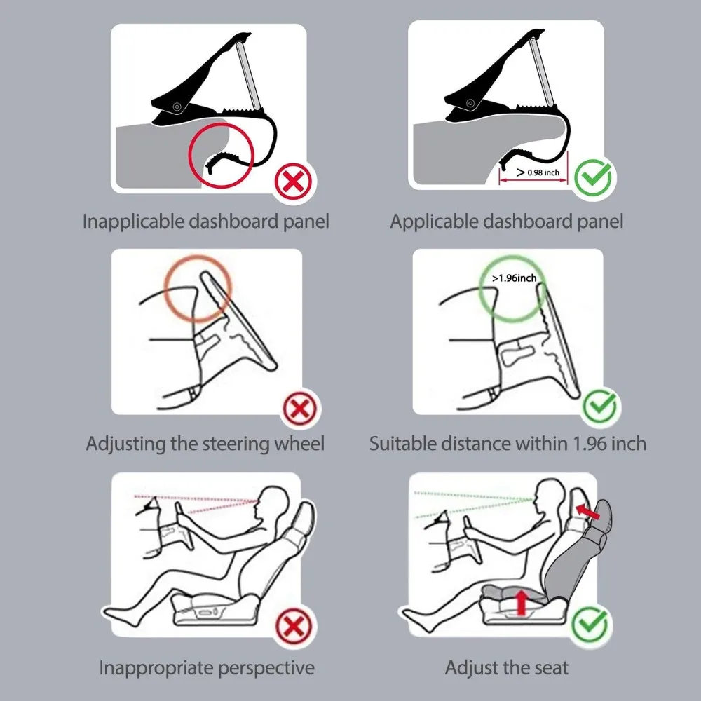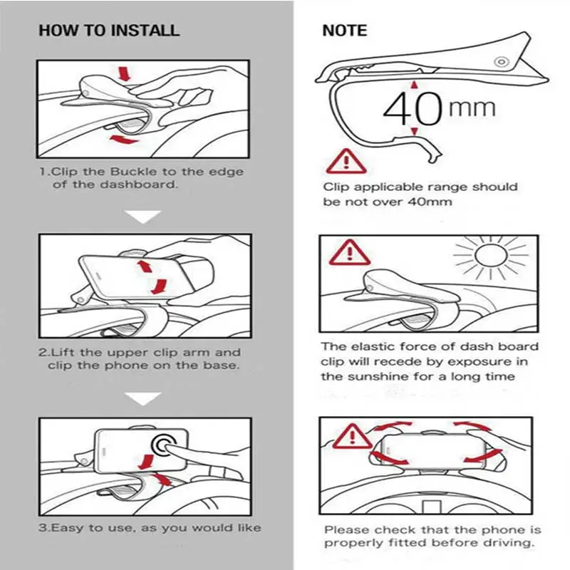 Puntas calientes-El tipo A tiene la goma en la abrazadera. El tipo B no tiene la goma. Por favor, compruebe las imágenes.-Las aberturas no deben exceder los 40mm.-No lo exponga al sol durante mucho tiempo.-Compruebe que el teléfono esté correctamente instalado antes de conducir.-Si su tablero superior es demasiado delgado para agarrarlo, puede agregar un poco de acolchado antideslizante entre el agarre para apretarlo.-No se recomienda el Ancho de Sujeción del teléfono de menos de 2 pulgadas, porque se caerá fácilmente.EspecificaciónTipo de dispositivo: soporte para cocheApto para el tamaño del dispositivo: 3,5 "-6,5"Tamaño máximo del rango del clip base: 25mmSimple y cómodo de instalarFirme y duroLugar de aplicación: CocheEl paquete incluye1 x soporte para salpicadero de cochePóngase en contacto con nosotros si necesita un paquete al por menor.Cómo instalar1. Sujete la base al borde del salpicadero.2. Utilice el teléfono para levantar el clip superior y ajustar el teléfono.3. Ajuste fácilmente el ángulo como desee.Consejos de instalación