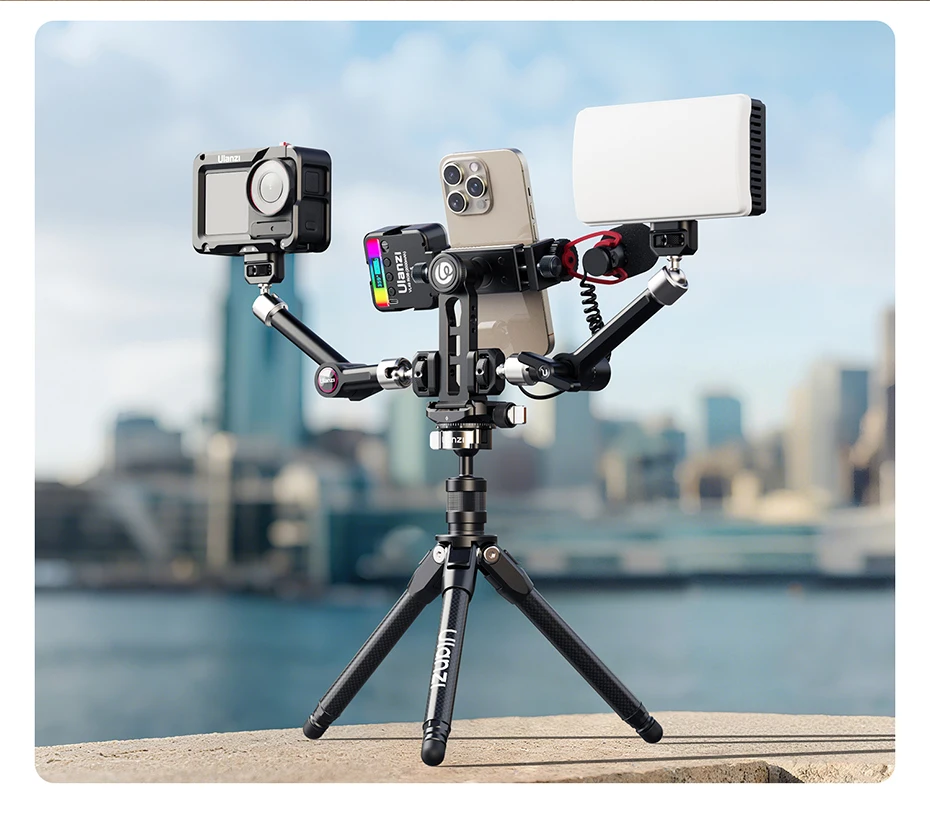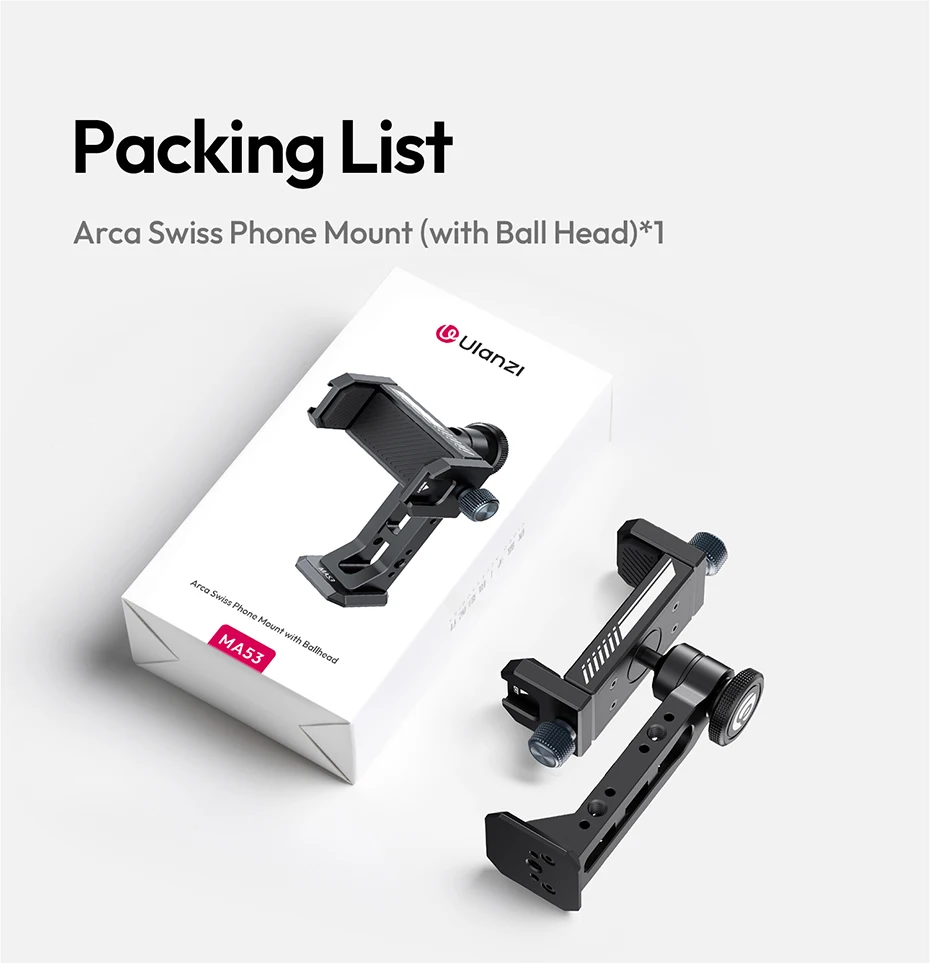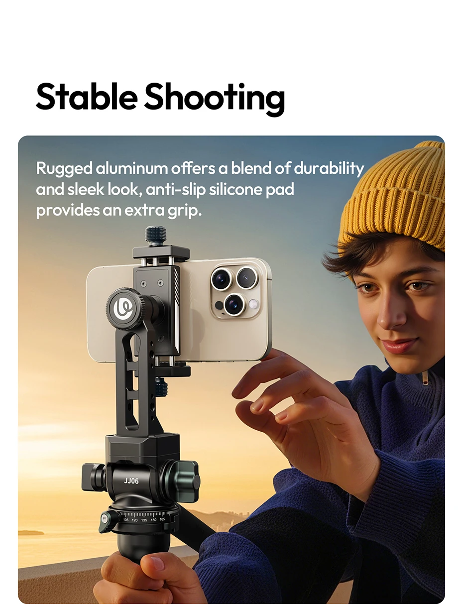 Es resistente porque es de aluminio y utiliza un sistema de tornillos en lugar de un resorte, lo que lo hace sin esfuerzo. Se puede instalar. Hay un orificio de 1/4 de pulgada en la parte inferior, que permite la conexión a un trípode y el uso con una rótula. Ángulo libre ajustable. Un poco pesado es el inconveniente...