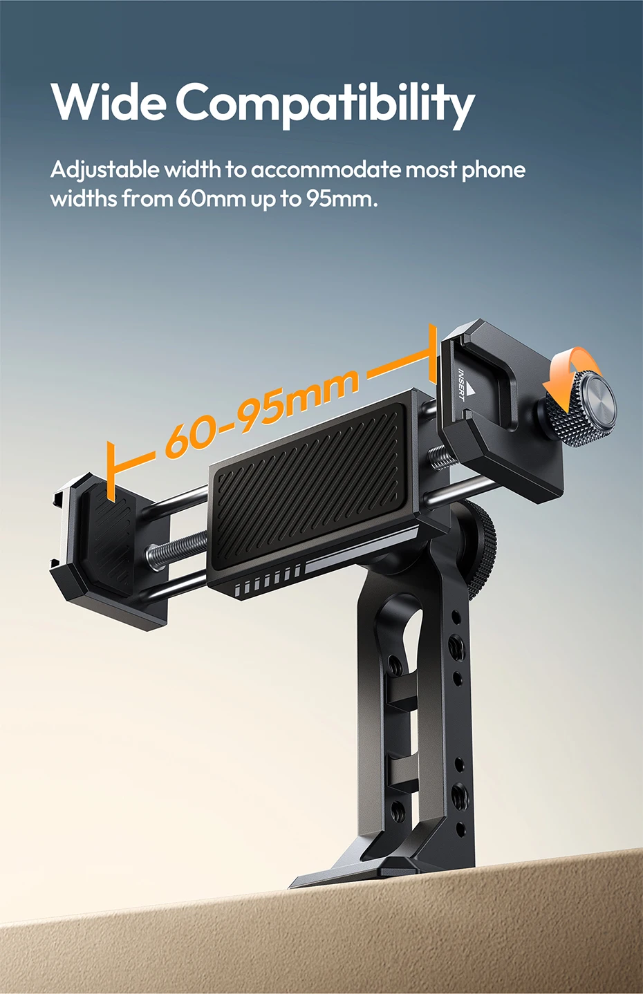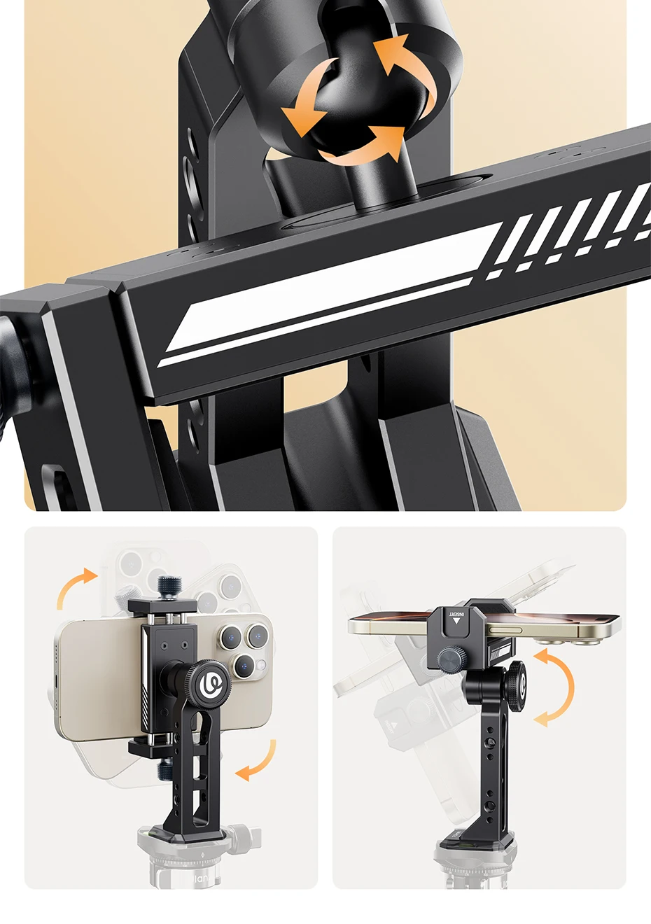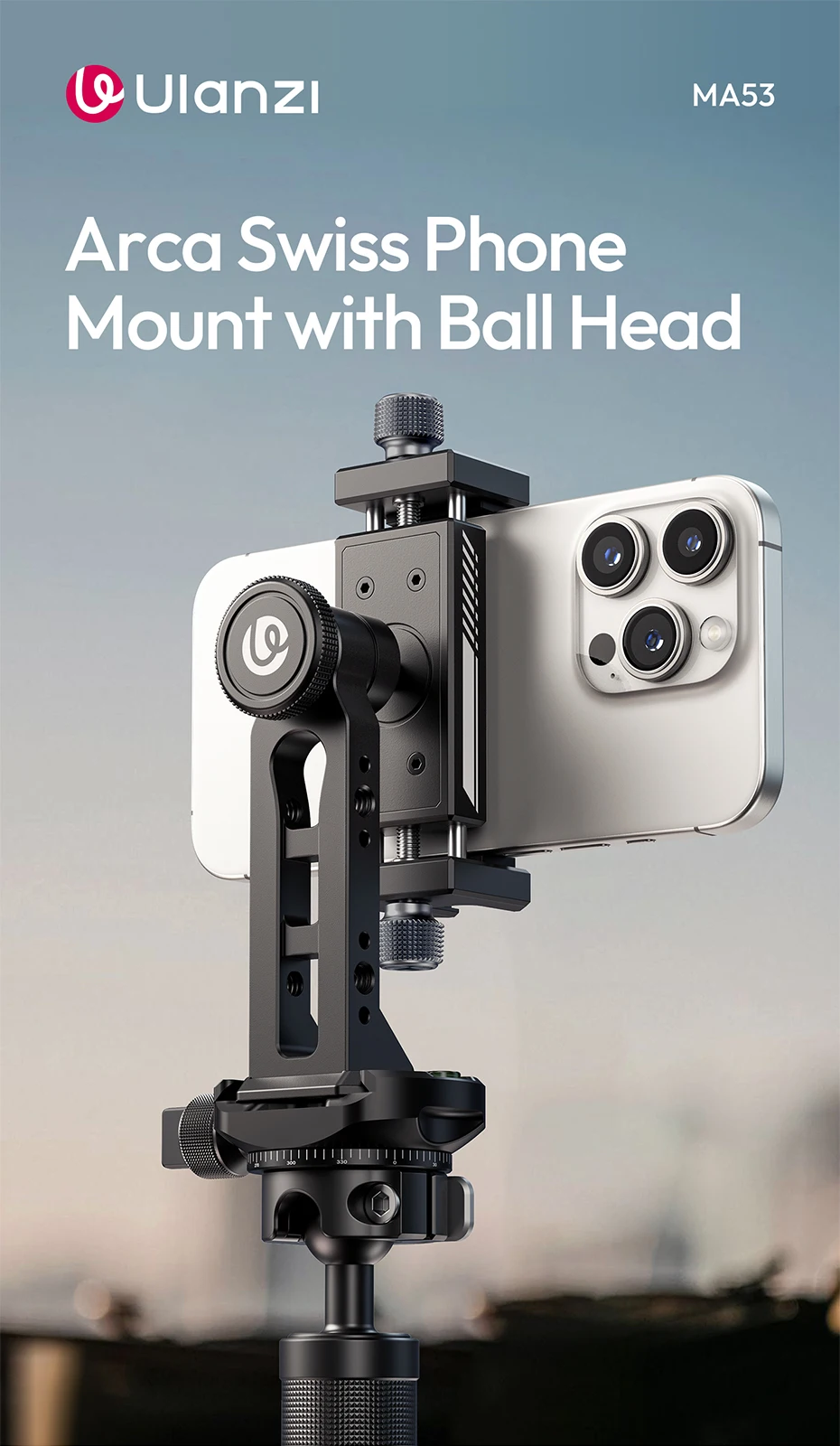 Es resistente porque es de aluminio y utiliza un sistema de tornillos en lugar de un resorte, lo que lo hace sin esfuerzo. Se puede instalar. Hay un orificio de 1/4 de pulgada en la parte inferior, que permite la conexión a un trípode y el uso con una rótula. Ángulo libre ajustable. Un poco pesado es el inconveniente...