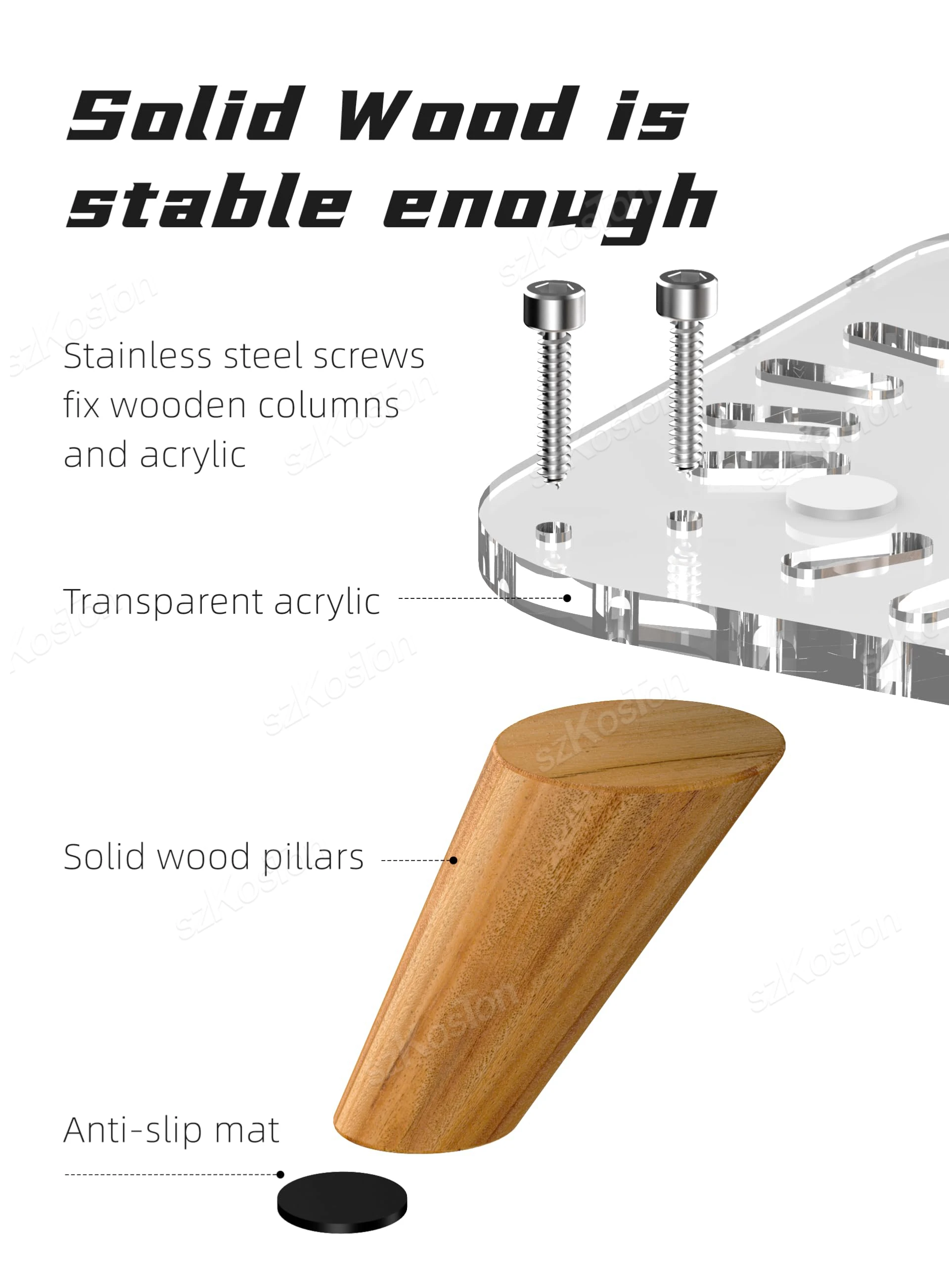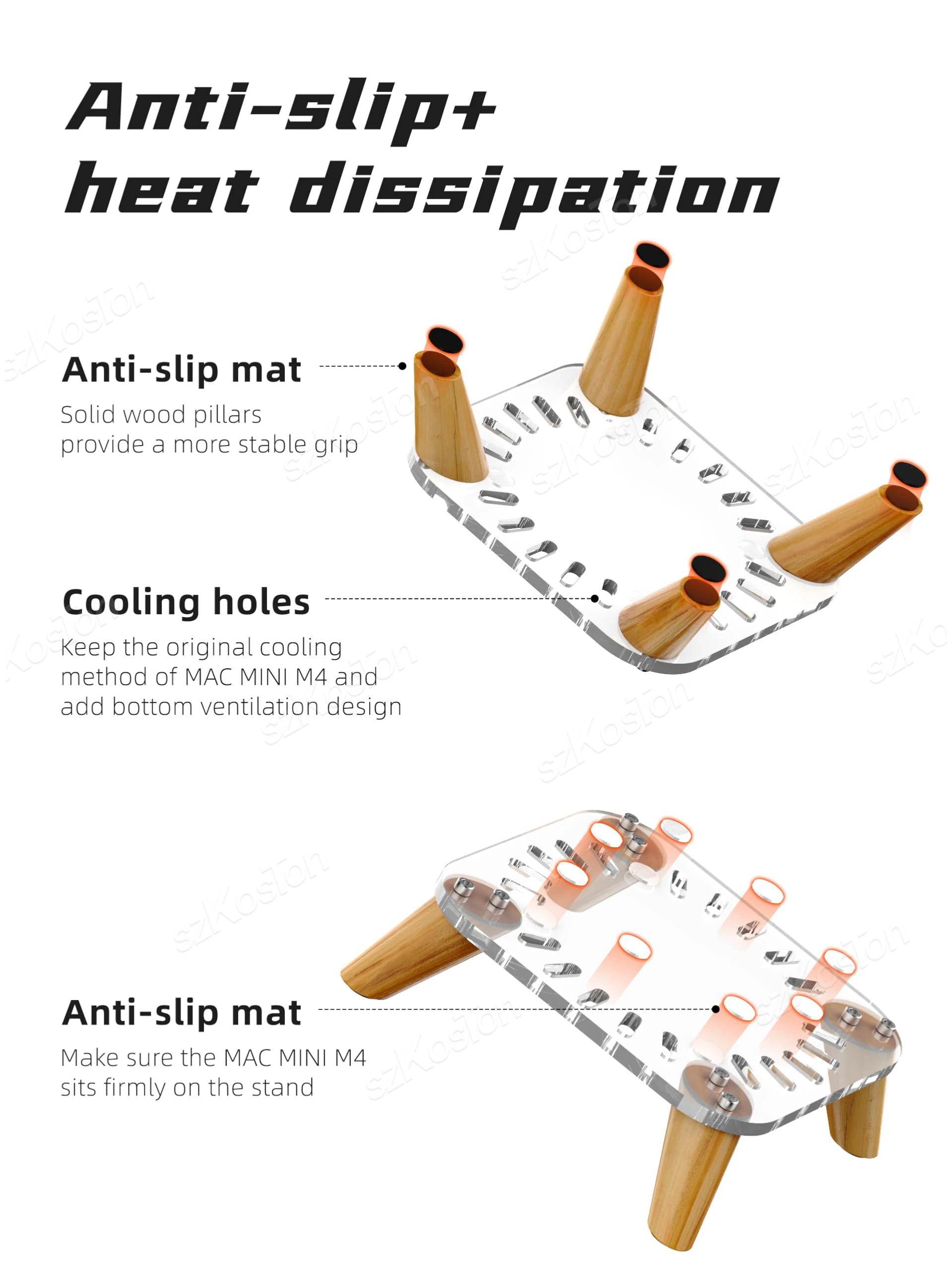 3.Protección antideslizante: el soporte viene con 4 almohadillas de silicona antideslizantes en el acrílico cuando se coloca el Mac Mini M4 y también viene con almohadillas antideslizantes en la parte inferior de los 4 pies de madera maciza para garantizar estabilidad y antideslizamiento..
