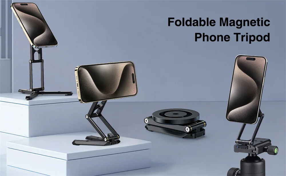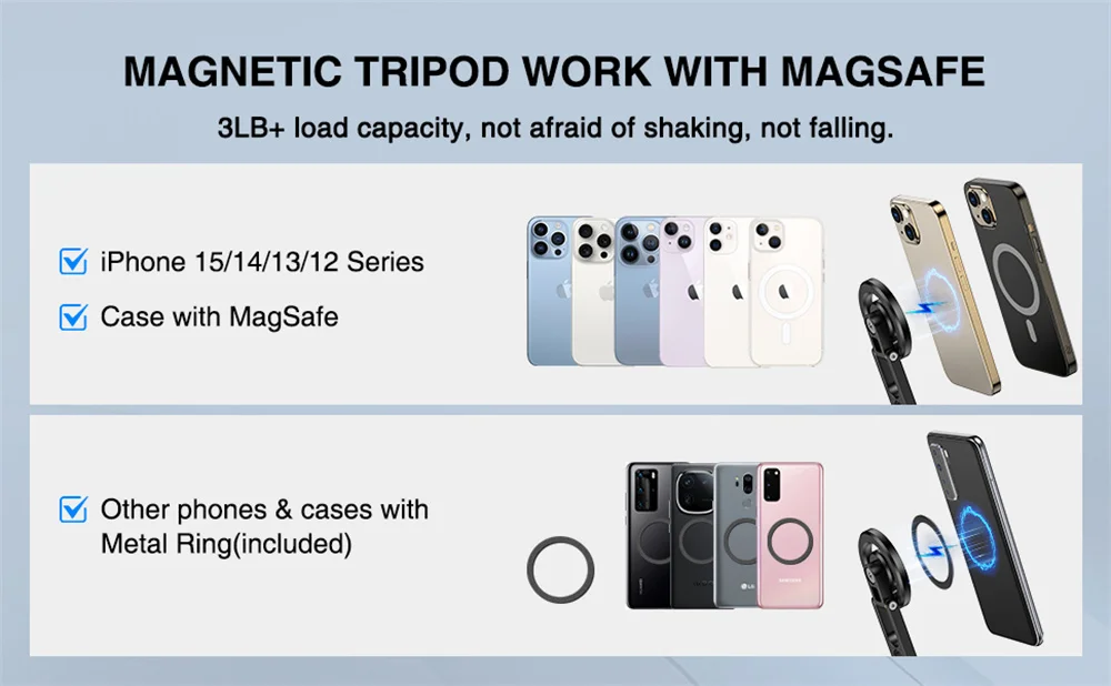 Trípode magnético de compatibilidad perfecta✅El magnético compatible con iPhone 15/15 Plus/15 Pro/15 Pro Max/14/14 Plus/14 Pro/14 Pro Max/13/13 Pro/13 mini/13 Pro Max/12/12 Pro/12 mini/12 Pro Max, fundas protectoras magnéticas oficiales, etc. El anillo de metal magnético incluido en el paquete se puede conectar a iPhone 11 e inferiores, teléfonos Android, Y fundas para un efecto MagSafe que mantiene tu teléfono completamente estable.