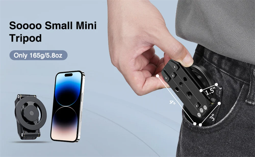 Soporte de trípode compacto más pequeño✅El trípode de teléfono pequeño pesa solo 165 gramos, más ligero que un teléfono inteligente promedio, pero no agrega volumen. El tamaño de almacenamiento de solo 100mm/4 pulgadas, más pequeño que un teléfono celular, garantiza la capacidad de bolsillo sin esfuerzo, lo que lo convierte en el compañero definitivo para aventuras de video al aire libre.