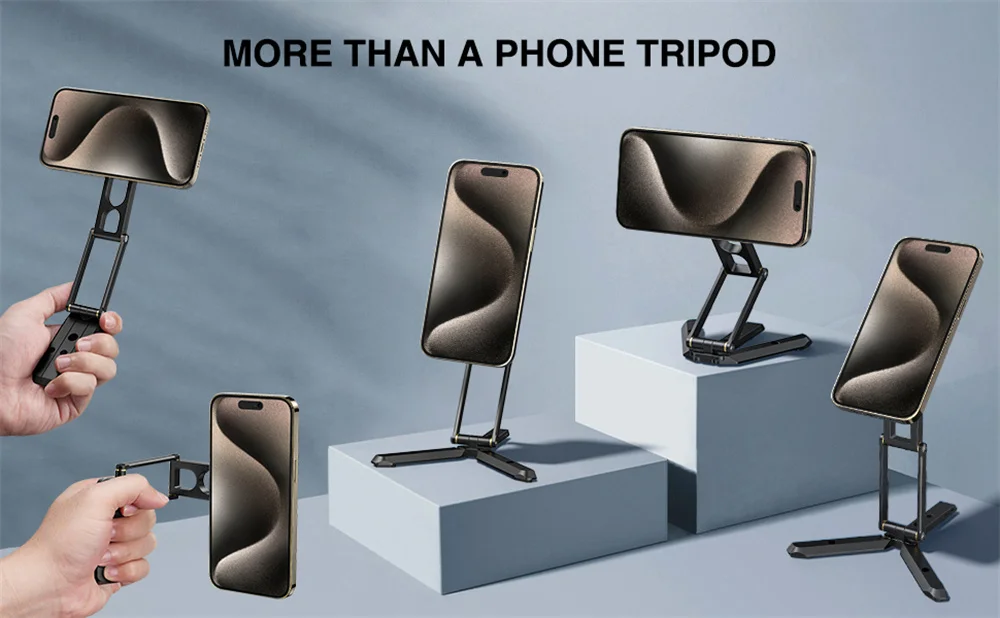 Ángulo libre de tres pliegues ajustable✅El diseño triple incluye una altura de extensión adicional y un agarre más grande para mayor comodidad. Su longitud se ajusta sin esfuerzo desde 3,15 pulgadas (80mm) hasta 10,24 pulgadas (260mm), mientras alcanza una elevación máxima expandida de 7,1 pulgadas (180mm), Y cada ángulo de plegado admite 310 °, 360 °, 180 ° de ajuste. Con un pivote giratorio de 360 grados en la parte inferior, este mini trípode para teléfono permite ubicar fácilmente la cámara del teléfono en posiciones superiores, ascendentes, verticales y otras posiciones de disparo