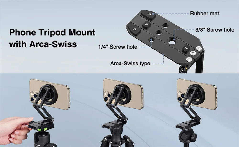 Arca Base Teléfono Trípode Montaje✅Doble las tres patas divididas sin esfuerzo y conviértalo en una placa de liberación rápida Arca, lo que permite una fijación rápida a cualquier cabeza de trípode con el mismo sistema de montaje. La montura también cuenta con una versátil variedad de orificios para tornillos inferiores (3x1/4 ''y 1x3/8'') para una integración perfecta con trípodes, monopiés, cardanes y más sistemas.