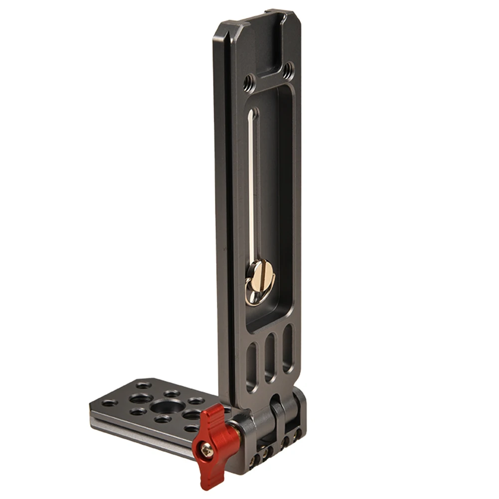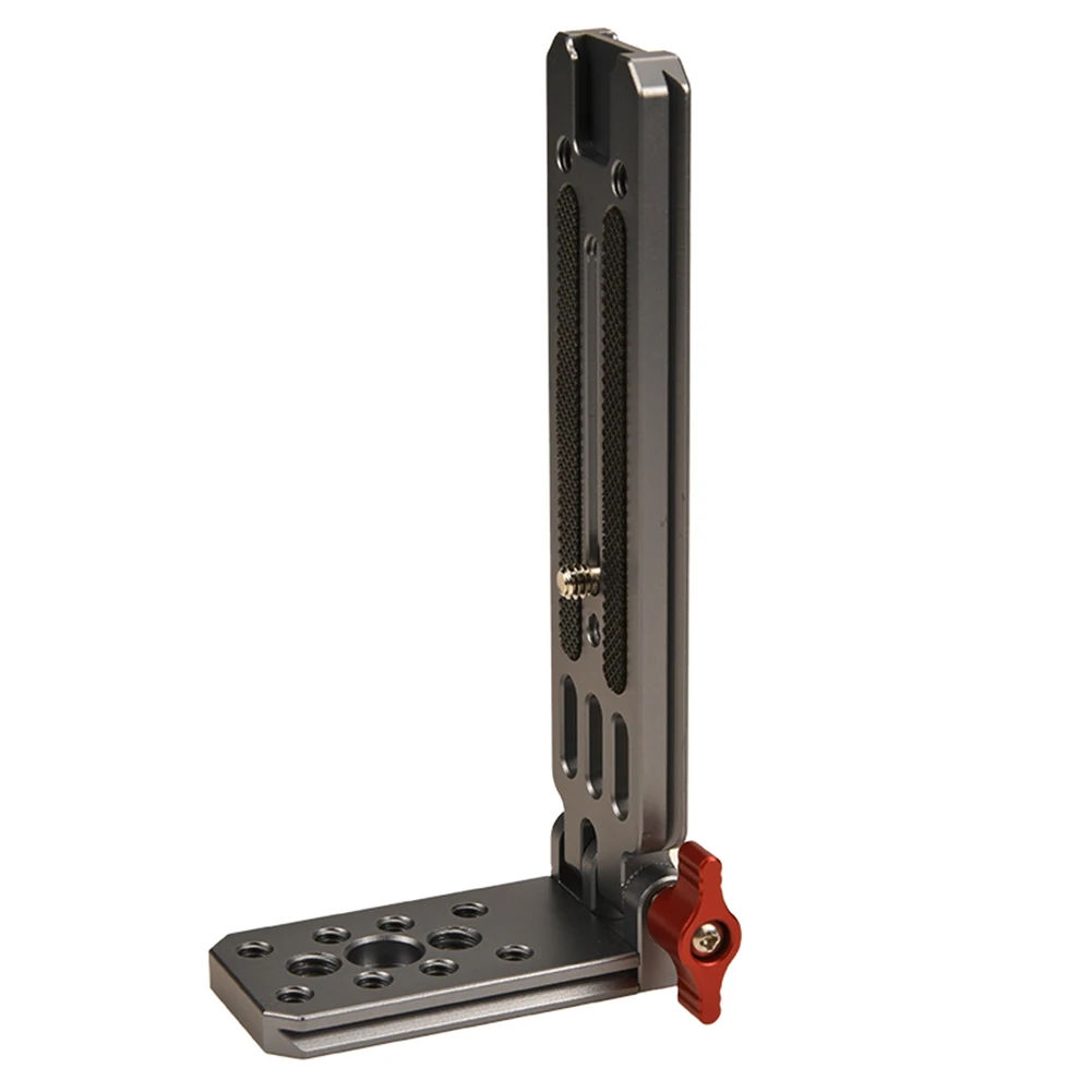 4.Enchufe de montaje del accesorio:El soporte en forma de L está equipado con un enchufe de montaje para accesorios de 1/4"-20, que brinda opciones de fijación adicionales para accesorios como luces, micrófonos o monitores externos.Esto mejora la versatilidad del soporte y permite a los fotógrafos personalizar su configuración según sus necesidades específicas.