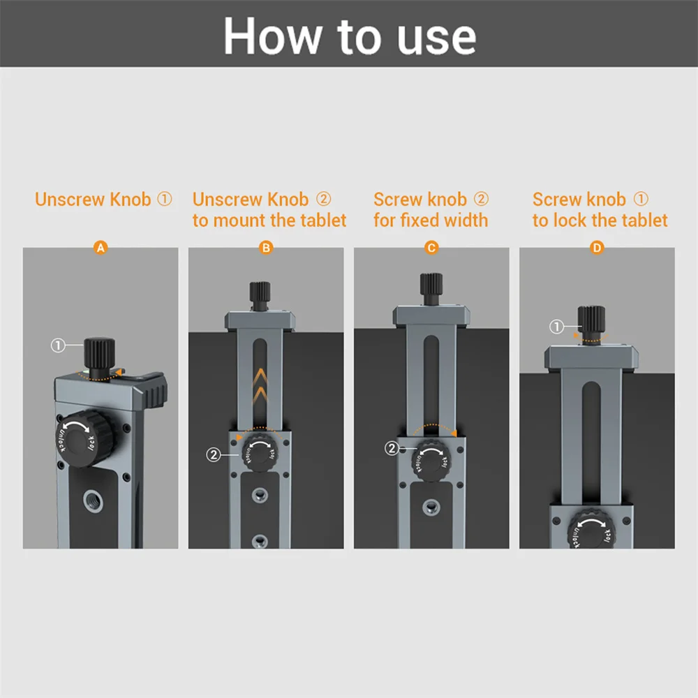 Con un tornillo de 1/4 ''en la parte superior y posterior de la abrazadera, convenientemente posicionado para acoplar la tableta/iPad con un trípode monopié u otros soportes comunes con un tornillo de 1/4''