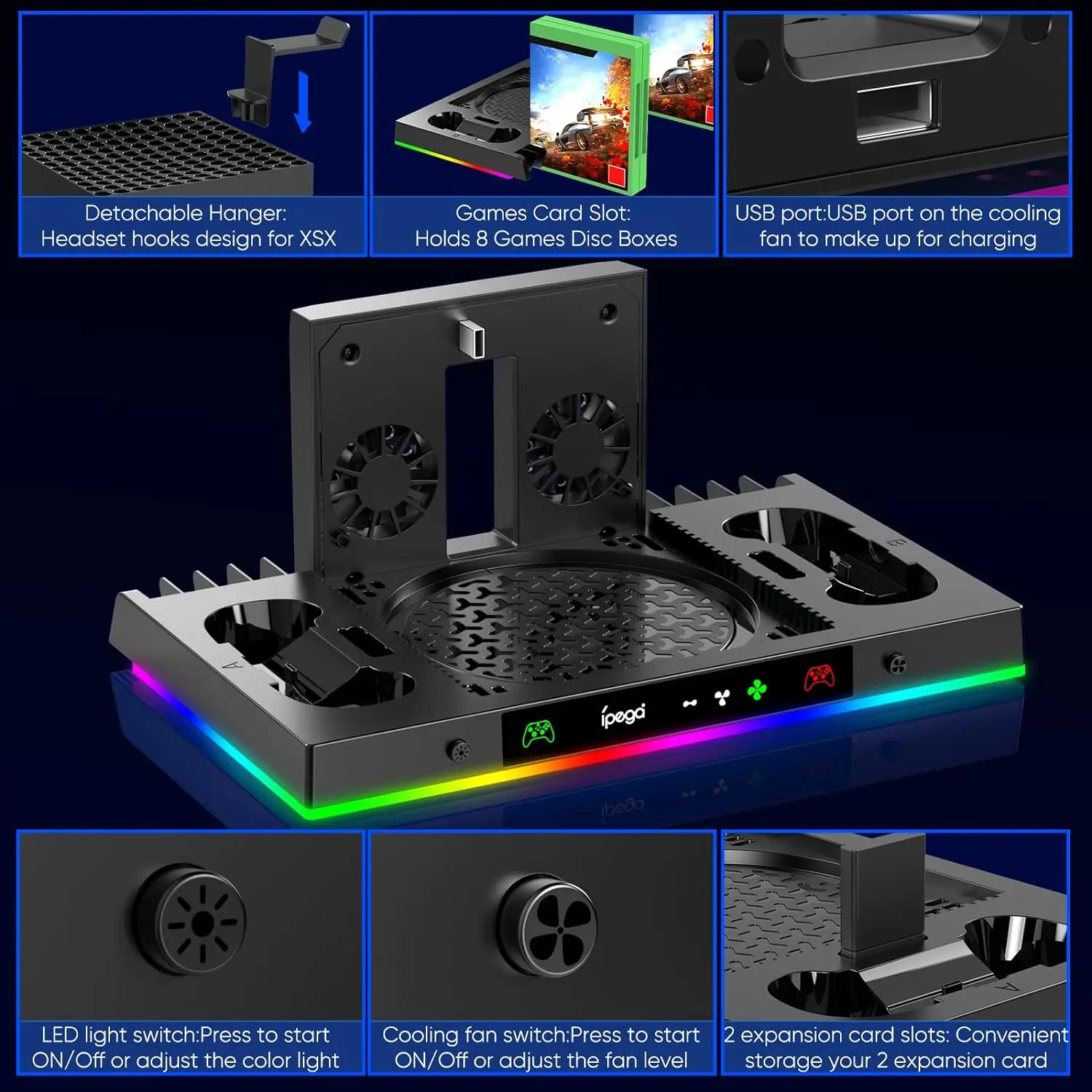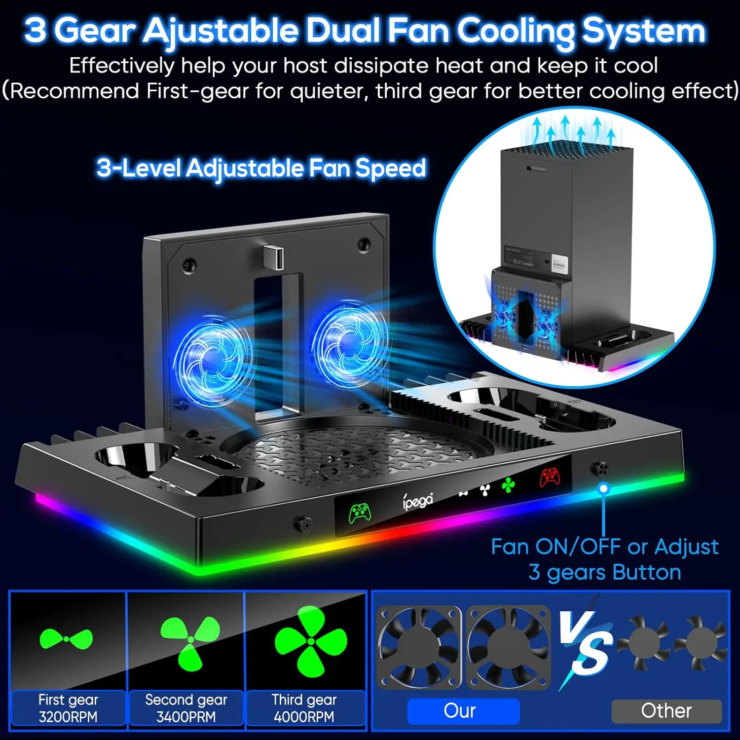 Comprar Soporte de ventilador de refrigeración y estación de carga para consola y controlador Xbox Series X con luz de Color de 15RGB, almacenamiento con sistema de ventilador de 3 niveles